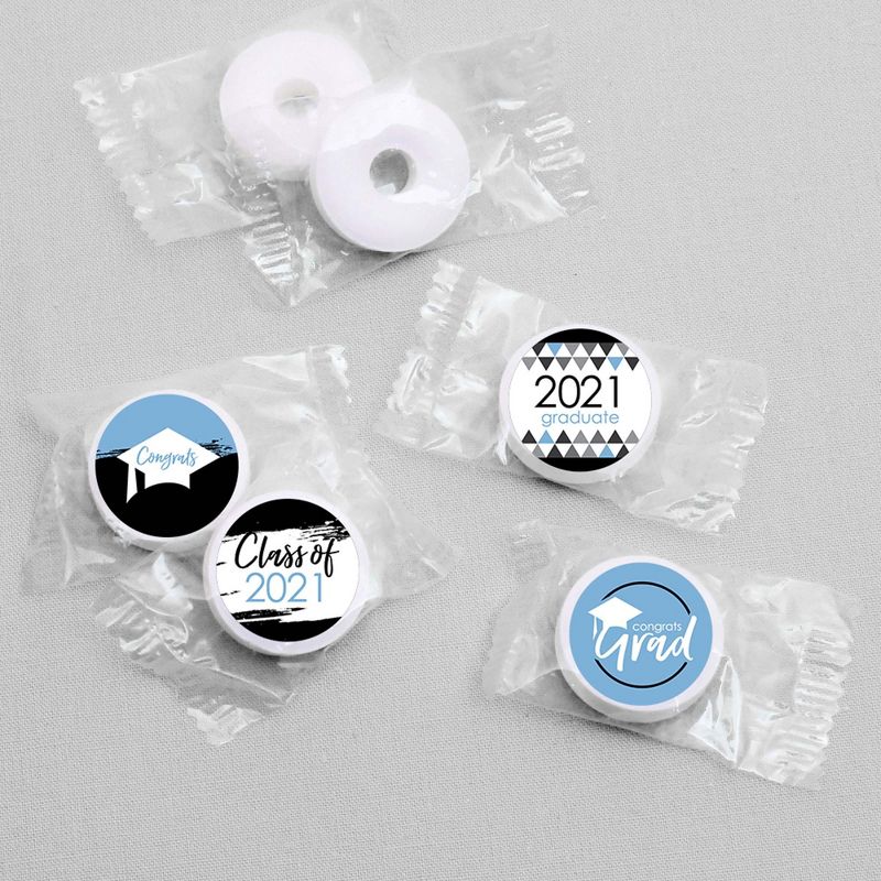 Light Blue Grad - Best is Yet to Come Round Candy Favor Labels INCLUDES 108 round candy stickers - perfect for styling adorable light blue and black candy favors. Round candy labels will fit a variety of small candies with a flat, round bottom, such as chocolate Hershey's® Kisses®, wrapped peppermints or gold-wrapped caramel candies. Light Blue Grad - Best is Yet to Come small, round candy stickers MEASURE .75 inches diameter and will quickly add a personal touch to all your sweet treats at the party. EASY PARTY DECORATIONS: Light Blue Grad - Best is Yet to Come round candy sticker labels are an easy party decoration to add to your list of party supplies. Scatter decorated candies down your dining tables, package in small gift bags as a party favor or display in a pretty bowl at your candy buffet. Get creative with your light blue DIY graduation party decoration ideas! PREMIUM PARTY SUPPLIES: Light Blue Grad - Best is Yet to Come round candy labels are professionally printed on sticker paper with a photo-like shine. They are individually inspected and carefully packaged by hand. Simply attach each round candy sticker to your chosen candies. MADE IN THE USA: Light Blue Grad - Best is Yet to Come - Graduation Round Candy Sticker Favors are designed and manufactured at our Wisconsin facility using materials that are Made in America. Please Note: Candies are not included but are available at your local grocery store.