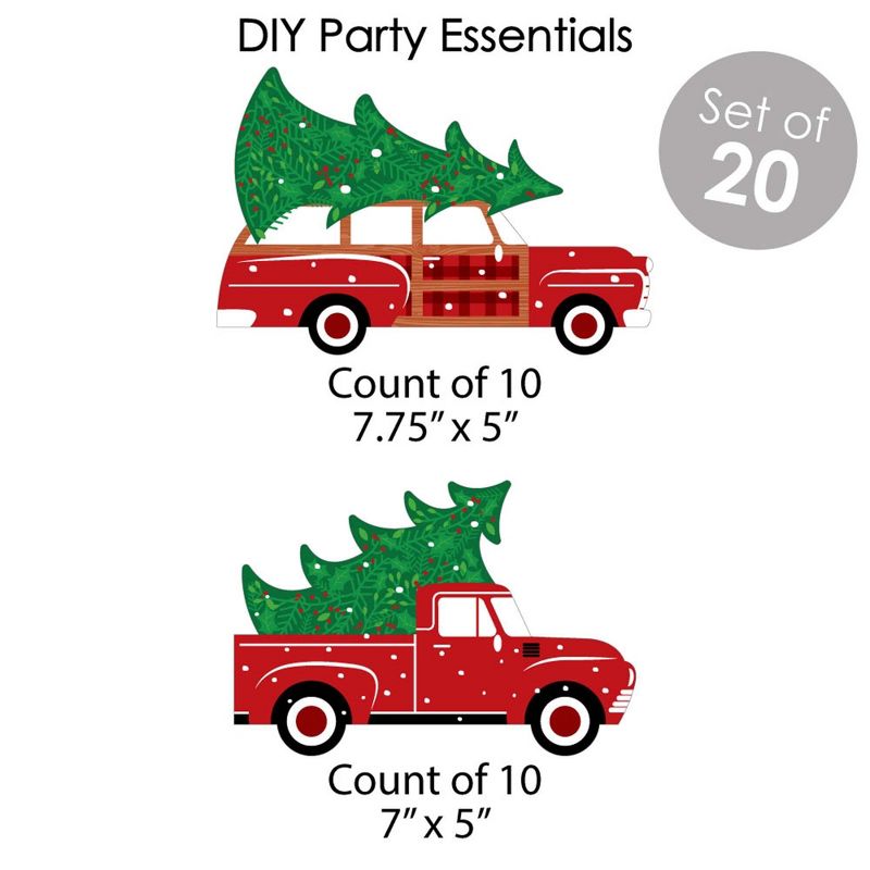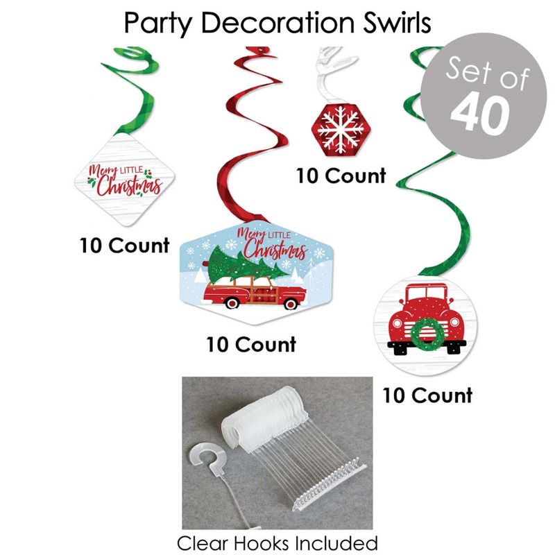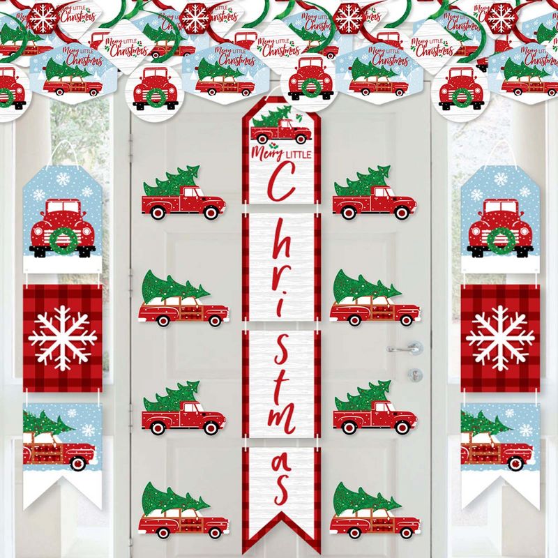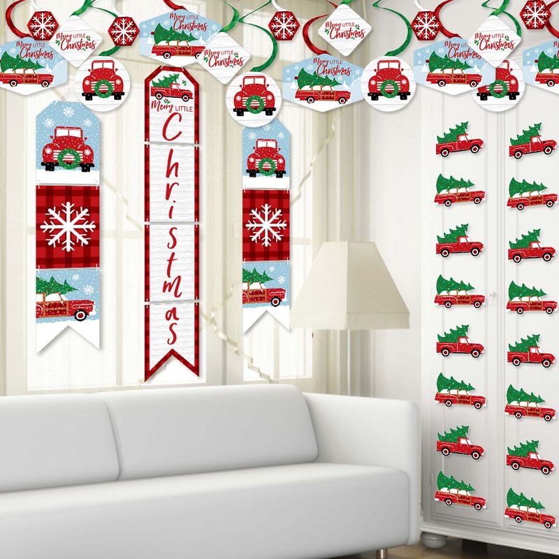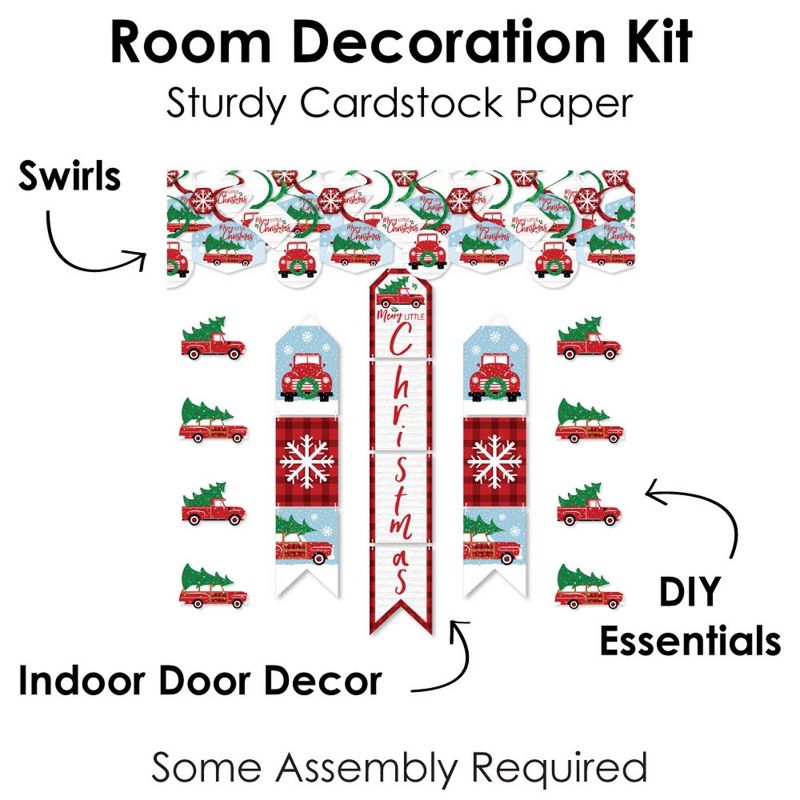 Merry Little Christmas Tree Room Decoration Kit INCLUDES 40 party decoration swirls, indoor door decor banner, and 20 shaped DIY party essentials. Fill the entire red truck and car Christmas with Merry Little Christmas Tree themed decorations. PARTY DECORATION SWIRLS: Includes 4 different shapes, 10 count per shape, that hang below an accordion-style spiral. Professionally printed double-sided, each decoration swirl in the 40-piece set has a pre-cut hole for easy DIY assembly using the included clear hooks. Party decoration swirls will arrive flat. INDOOR DOOR DECOR: Vertical hanging door banners are perfect way to welcome party guests. All banner sign pieces SIZE 7.5 inches wide x 10.75 inches. Each piece has pre-cut holes for easy DIY hanging with the included 10 yards of white 2mm satin cord. This DIY banner decor kit allows you to choose the spacing between each piece and string the cording through at your desired length. Clear adhesive stickers are also included to secure cording onto the back of each banner piece. DIY PARTY ESSENTIALS: Includes 20 shaped cut-outs in four different shapes. Each cut-out is professionally printed double-sided on sturdy cardstock paper. Use the red car and truck cut-outs for fun wall decorations, border the edges of a dessert table, or scatter across countertops and tables. MADE IN THE USA: Room Decoration Kit is designed and manufactured at our Wisconsin facility using materials that are Made in the USA.