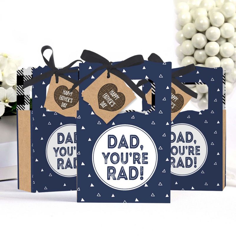 My Dad is Rad Favor Boxes INCLUDES 12 mom's favor bags, 12 gift tags and coordinating satin ribbon. Classic favor boxes are a party must-have. Dads theme party supplies are great for a Father's Day party. My Dad is Rad Favor Boxes SIZE 4.75 inches wide x 4.75 inches high x 2.25 inches deep (fillable inside space) with a total height of 7 inches, including the handle. The coordinating gift tags and ribbon makes these 12 Father's Day party favor boxes a complete treat bag party kit that everyone will love. DAD PARTY SUPPLIES: Father's Day party favor boxes will hold a variety of treats, prizes and party favors for your guests. Fill them with baked goodies, party trinkets or thank you gifts for adorable My Dad is Rad favors! PREMIUM PARTY FAVOR BOXES: My Dad is Rad favor boxes are professionally printed on heavy-duty cardstock paper with a photo-like shine. They are hand-folded and individually inspected, then carefully packaged. Favor boxes will arrive flat, partially assembled. Finishing assembly is required but it is easy. Once assembled, add the My Dad is Rad gift tag with the included ribbon for perfect party favors! MADE IN AMERICA: My Dad is Rad - Father's Day Party Favor Boxes are designed and manufactured at our Wisconsin facility.