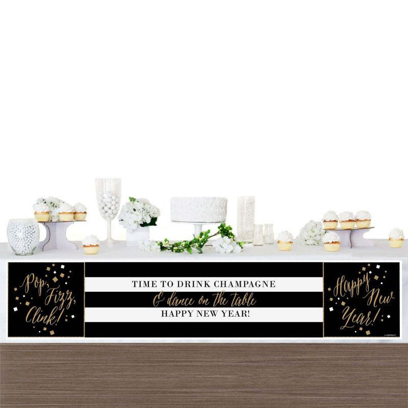 • Banner Reads: "Time To Drink Champagne & Dance On The Table Happy New Year!" and "Pop, Fizz, Clink!"