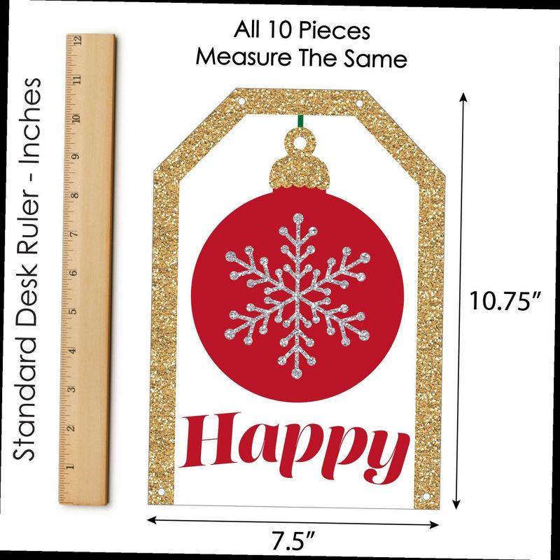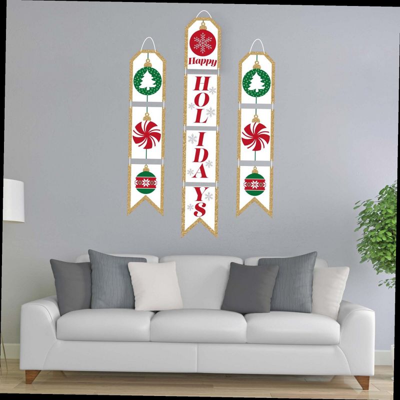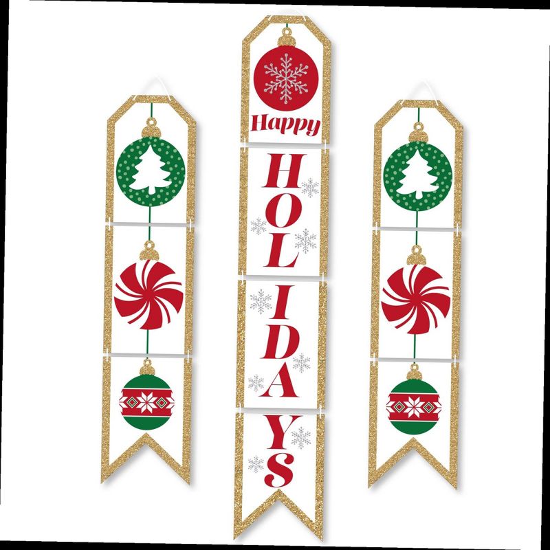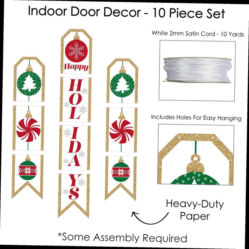 Ornaments Indoor Door Decor INCLUDES: 10 heavy-duty paper pieces to create 3 vertical banners and 10 yards white 2mm satin cord. Easy assembly required. FUN PARTY BANNER: Vertical hanging door banners will create that wow-factor at your Holiday or Christmas party. Hang at the entrance of your event, over the food or gift table, or any open wall space to create a fun focal point. WALL DECORATION KIT: All banner sign pieces SIZE 7.5 inches wide x 10.75 inches. Each piece has pre-cut holes for easy DIY hanging with the included 10 yards of white 2mm satin cord. This DIY banner decor kit allows you to choose the spacing between each piece and string the cording through at your desired length. Clear adhesive stickers are also included to secure cording onto the back of each banner piece. PREMIUM PARTY SUPPLIES: Ornaments hanging vertical door banner decoration pieces are professionally printed one-sided on heavy-duty cardstock paper. Each banner piece is individually inspected and carefully packaged by hand. Red and Green Christmas wall decoration kit requires some easy assembly. Follow the number sequence on the back of each banner piece and simply string the included cording through the pre-cut holes. MADE IN THE USA: Ornaments paper door banner decoration kit is designed and manufactured at our Wisconsin facility using materials that are Made in the USA. Ornaments Indoor Door Decor use a No-Mess Glitter Print: Our DIY party banner decorations are designed with a printed image of glitter, eliminating glitter flake while maximizing bling effect!