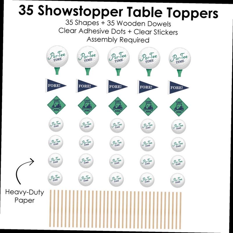 Par-Tee Time - Golf Showstopper Table Toppers INCLUDE: 35 heavy-duty paper centerpiece cut-outs in our Par-Tee Time - Golf theme. Each cut-out shape is printed double-sided and includes 35 wooden dowel sticks. DIY assembly is required. EASY TABLE DECORATIONS: Par-Tee Time - Golf showstopper party centerpieces come with a variety of fun shapes and in the perfect sizes to create impressive tabletop decorations. Place assembled centerpiece sticks into jars or floral arrangements for that showstopper wow-factor. DIY PARTY CENTERPIECES: Par-Tee Time - Golf party centerpiece kit arrives with wooden dowels and reinforcing stickers for easy DIY assembly. Simply press the included reinforcing sticker onto one dowel stick, near the end of dowel. Then, firmly press dowel to the back of a table topper shape. HIGH-QUALITY PARTY SUPPLIES: Par-Tee Time - Golf showstopper table toppers are professionally printed double-sided on sturdy cardstock paper with a photo-like shine. They are individually inspected and carefully packaged by hand. Showstopper table toppers will arrive unassembled, leaving your DIY retirement or birthday party idea options endless. MADE IN THE USA: Par-Tee Time - Golf showstopper table toppers are designed and manufactured at our Wisconsin facility using materials that are Made in the USA.