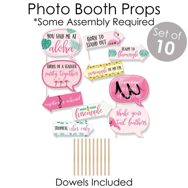 Doterrific Bundle INCLUDES: Bunting Banner "Let's Flamingle", Paper Chains Garland 21 Feet, and Funny Photo Booth Props Kit 10-Piece. Style any baby shower or birthday party with coordinating Pink Flamingo - Party Like a Pineapple-themed party supplies. Use Pink Flamingo - Party Like a Pineapple Doterrific Bundle to create an impressive photo booth backdrop. Please Note: Assembly Required. BUNTING BANNER: Greet your party guests with a Pink Flamingo - Party Like a Pineapple bunting banner. Assemble the themed pennant flags with included ribbon and hang with the included wall mount adhesives. Each pennant measures 5.5 inches wide x 8.5 inches high. Satin ribbon measures 24 feet long and 3/8th of an inch wide. Hang at the entrance of your event, over the food table or candy buffet, at the gift table, or display in doorways or windows as a background for photo ops. PAPER CHAINS: Pink Flamingo - Party Like a Pineapple paper chains decoration kit will arrive flat and is easy enough for the whole family to assemble. The heavy-duty paper tassels give our paper chains a unique flair. Dress up all areas of your flamingo party with paper chains. For decorating fun, wrap paper chains down a staircase railing, hang above doorways, or use as a photo booth backdrop. For an effortless look, stretch paper chains garland down the center of your dining room table. PHOTO PROPS: 10-Piece Funny Pink Flamingo - Party Like a Pineapple photo booth props include 4 speech bubble shapes (10.25 inches wide x 8.25 inches tall), 6 arrow shapes (10.5 inches wide x 4.5 inches tall), 10 wooden dowel sticks (12 inches tall). For easy assembly, adhesive dots and stickers are included. Capture memorable photos of friends and family as they laugh at the funny-themed sayings. Use photo props and dowels as centerpieces or scatter props throughout your event space. MADE IN THE USA: Pink Flamingo - Party Like a Pineapple Doterrific Bundle is designed and manufactured at our Wisconsin facility using materials that are Made in the USA. Professionally printed on sturdy cardstock paper with a photo-like shine, our kit parts are individually cut, inspected, and carefully packaged.