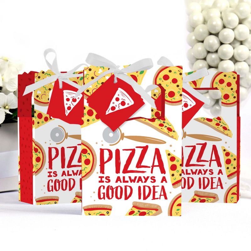 Pizza Party Time Favor Boxes INCLUDES 12 pizza party favor bags, 12 gift tags and coordinating satin ribbon. Classic favor boxes are a party must-have. Pizza theme party supplies are great for a baby shower or birthday party. Pizza Party Time Party Favor Boxes SIZE 4.75 inches wide x 4.75 inches high x 2.25 inches deep (fillable inside space) with a total height of 7 inches, including the handle. The coordinating gift tags and ribbon makes these 12 pizza party favor boxes a complete treat bag party kit that everyone will love. PIZZA PARTY SUPPLIES: Baby shower or birthday party favor boxes will hold a variety of treats, prizes and party favors for your guests. Fill them with baked goodies, party trinkets or thank you gifts for adorable Pizza Party Time party favors! PREMIUM PARTY FAVOR BOXES: Pizza Party Time party favor boxes are professionally printed on heavy-duty cardstock paper with a photo-like shine. They are hand-folded and individually inspected, then carefully packaged. Favor boxes will arrive flat, partially assembled. Finishing assembly is required but it is easy. Once assembled, add the Pizza Party Time gift tag with the included ribbon for perfect party favors! MADE IN AMERICA: Pizza Party Time - Baby Shower or Birthday Party Favor Boxes are designed and manufactured at our Wisconsin facility.
