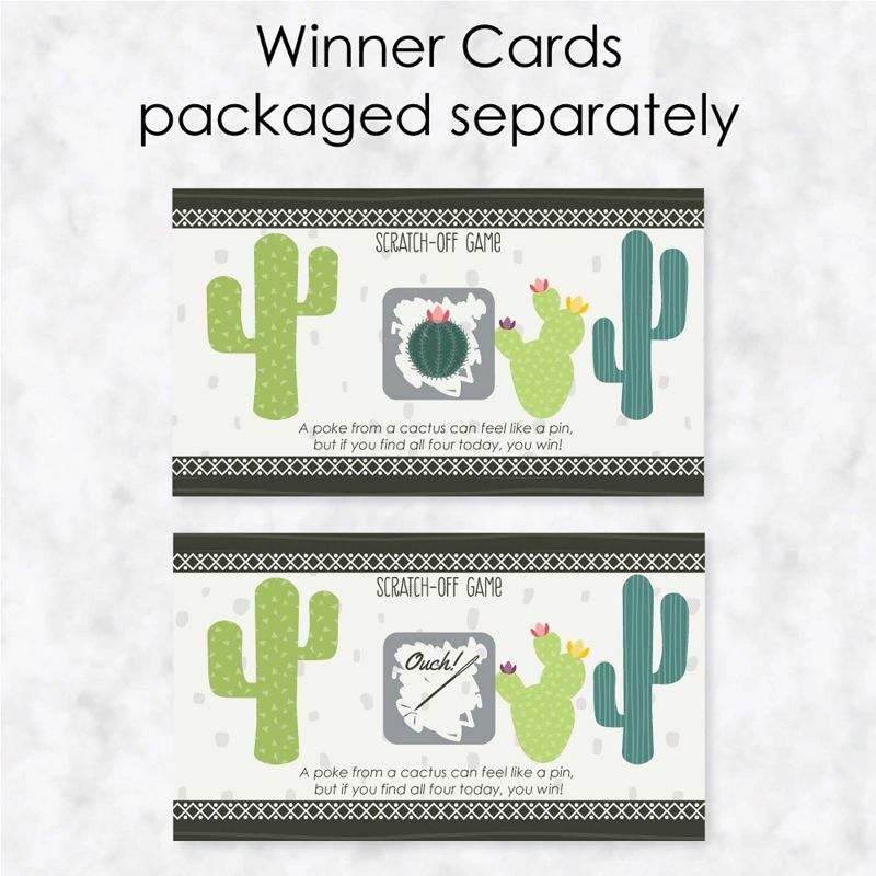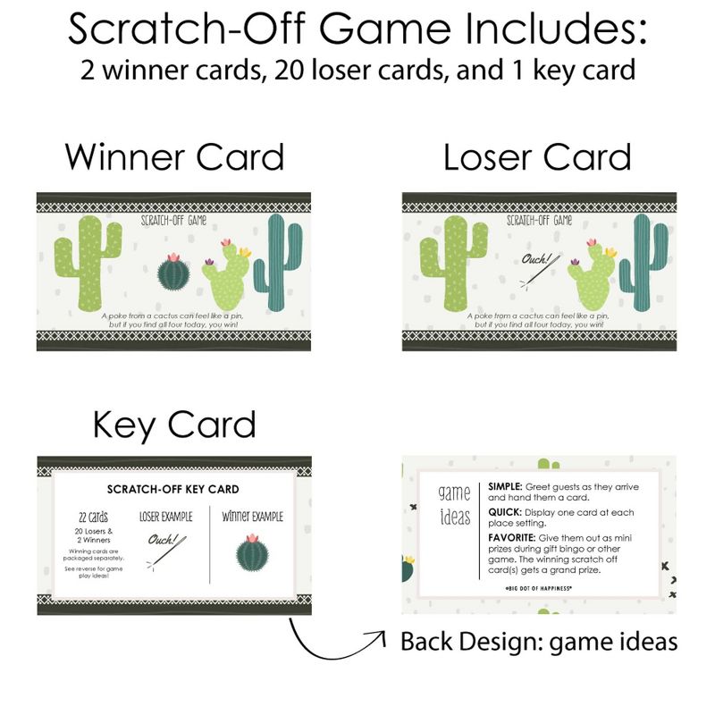 Prickly Cactus Party Scratch-Off Cards INCLUDES 22 fiesta party game cards: 20 "loser" cards and 2 "winner" cards. FUN PARTY GAME: Prickly Cactus Party scratch-off cards will be enjoyed by fiesta party guests of all ages. Each game card measures 2.75" tall x 4.75" wide. Winner and loser game cards are packaged separately so it is easy to pre-select the game winners if you choose. 3 WAYS TO PLAY: Simple - Greet guests as they arrive and hand them a scratch-off card. Quick - Display one scratch-off card at each place setting and have guests play before eating. Favorite - Give scratch-off cards out as mini prizes during other party games. The winning scratch off card(s) gets a grand prize. HIGH-QUALITY PARTY SUPPLIES: Prickly Cactus Party Scratch-Off Cards are professionally printed on heavy-duty cardstock paper with a photo-like shine. They are individually inspected and carefully packaged by hand, with winner cards and loser cards clearly marked. This fun fiesta party game will arrive ready to use at your party. MADE IN THE USA: Prickly Cactus Party - Fiesta Party Game Scratch Off Cards are designed and manufactured at our Wisconsin facility using materials that are Made in the USA.