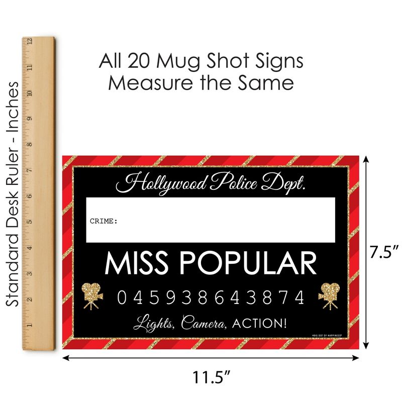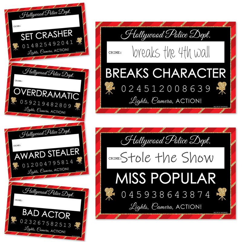 Mugshot Photo Booth Props INCLUDES 20 Red Carpet Hollywood mugshot signs with unique crime prompts and space to write in the individual "crime." Take entertaining and shareable prom, homecoming, bachelorette or birthday party photos of your friends and family while making memories with funny Red Carpet Hollywood mug shot photo booth props! PERFECT FOR ANY CROWD! Funny mug shot photo booth signs include crime prompts for both adults and kids - everyone will love posing with their accusation or party foul. Simply write in their violation with your own black marker and pose for the camera! Red Carpet Hollywood Mugshot Photo Prop Signs MEASURE 11.5 inches x 7.5 inches. FUNNY MUGSHOT CRIMES: There are 20 unique Hollywood police dept. crime prompts, one on each sign LINE FORGETTER, BAD INFLUENCE, WILD ONE, I DIDN’T DO IT, STUNT DOUBLE, BREAKS CHARACTER, DRAMA QUEEN, SET CLOWN, OVERDRAMATIC, BAD ACTOR, VOICE-OVER ACTOR, TOTAL DIVA, BAD ACTRESS, PAPARAZZI, MISS POPULAR, SET CRASHER, AWARD STEALER, USES CURSE WORDS, RED CARPET ROBBER, BAD DIRECTOR. HIGH-QUALITY HOLLYWOOD PARTY SUPPLIES: Red Carpet Hollywood prom, homecoming, bachelorette or birthday party mugshot photo booth props are professionally printed on thick cardstock paper. They will arrive cut out and ready to use with friends and family at your party or take out and use throughout the night at a variety of locations! MADE IN THE USA: Red Carpet Hollywood Party Mug Shots are designed and manufactured at our Wisconsin facility using materials that are Made in the USA. Please Note: The Mug Shot Photo Booth Height Chart Backdrop is sold separately. Hollywood mug shots use a No-Mess Glitter Print: Our mug shot props are designed with a printed image of glitter, eliminating glitter flake while maximizing bling effect!