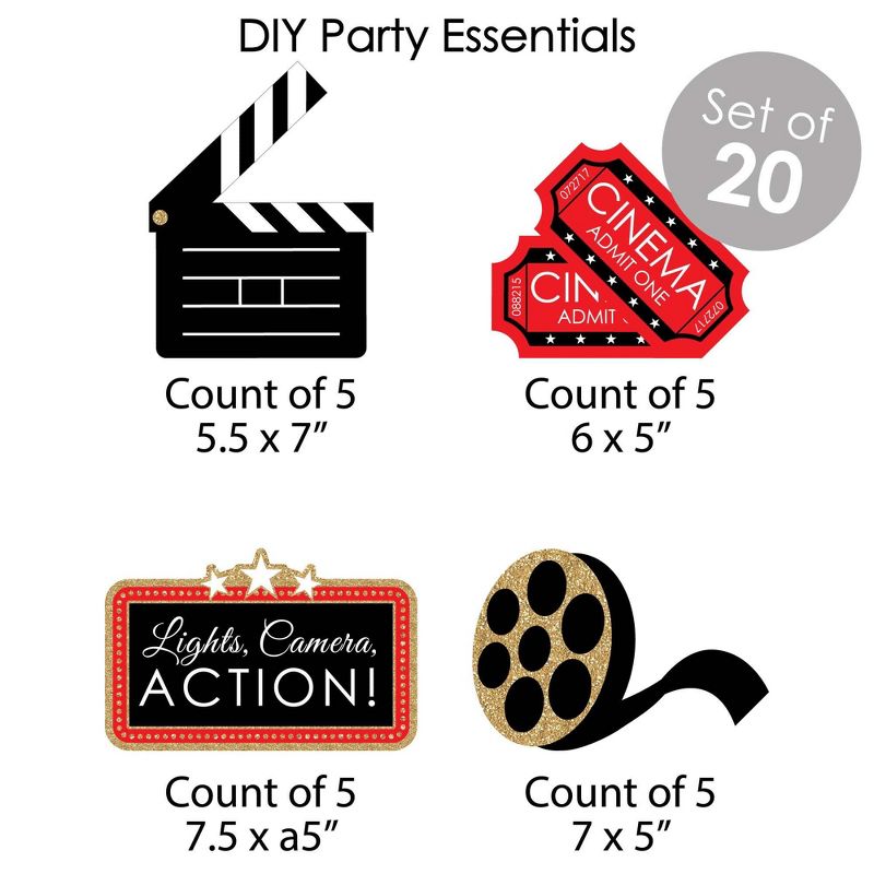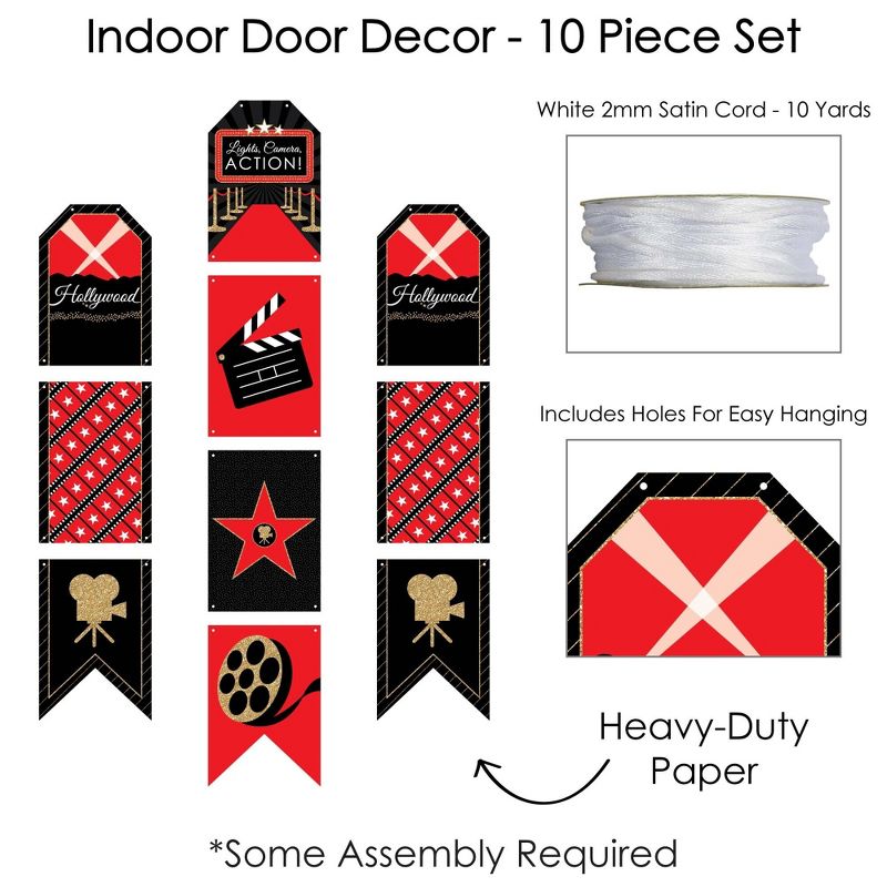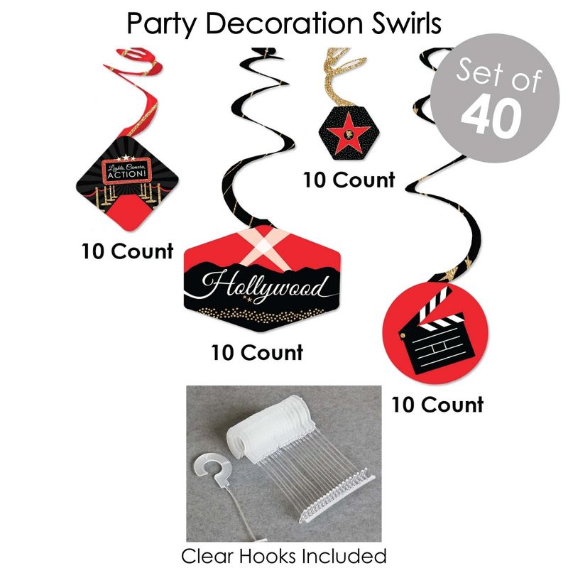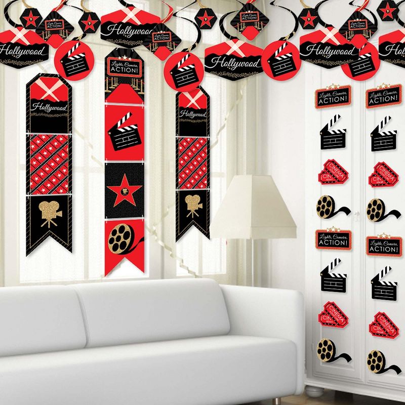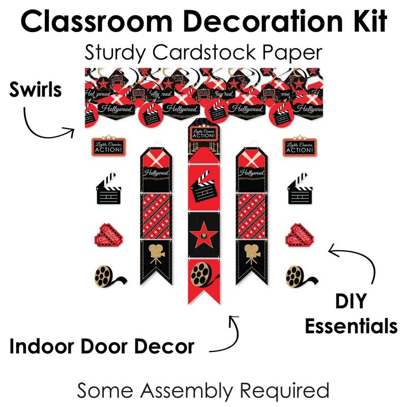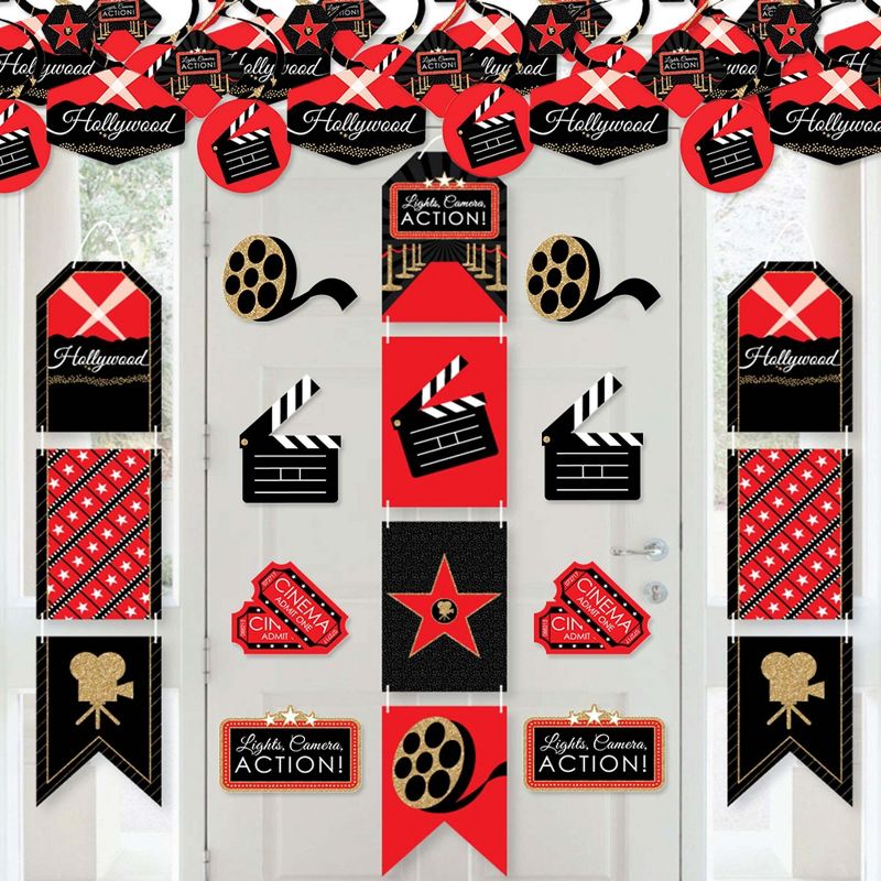 Red Carpet Hollywood Room Decoration Kit INCLUDES 40 party decoration swirls, indoor door decor banner, and 20 shaped DIY party essentials. Fill the entire movie night party with Red Carpet Hollywood themed decorations. PARTY DECORATION SWIRLS: Includes 4 different shapes, 10 count per shape, that hang below an accordion-style spiral. Professionally printed double-sided, each decoration swirl in the 40-piece set has a pre-cut hole for easy DIY assembly using the included clear hooks. Party decoration swirls will arrive flat. INDOOR DOOR DECOR: Vertical hanging door banners are perfect way to welcome party guests. All banner sign pieces SIZE 7.5 inches wide x 10.75 inches. Each piece has pre-cut holes for easy DIY hanging with the included 10 yards of white 2mm satin cord. This DIY banner decor kit allows you to choose the spacing between each piece and string the cording through at your desired length. Clear adhesive stickers are also included to secure cording onto the back of each banner piece. DIY PARTY ESSENTIALS: Includes 20 shaped cut-outs in four different shapes. Each cut-out is professionally printed double-sided on sturdy cardstock paper. Use the tickets, movie reel and clapperboard cut-outs for fun wall decorations, border the edges of a dessert table, or scatter across countertops and tables. MADE IN THE USA: Room Decoration Kit is designed and manufactured at our Wisconsin facility using materials that are Made in the USA. Red Carpet Hollywood Room Decor use a No-Mess Glitter Print: Our room decorations are designed with a printed image of glitter, eliminating glitter flake while maximizing bling effect!