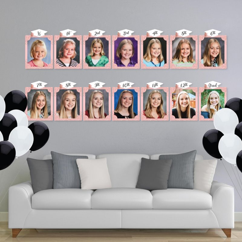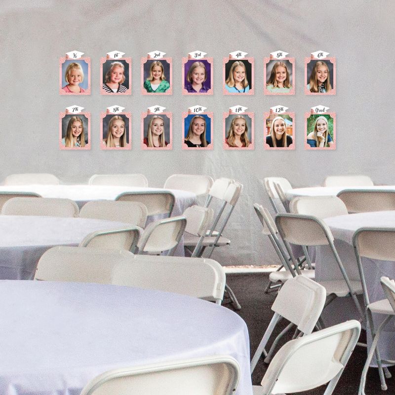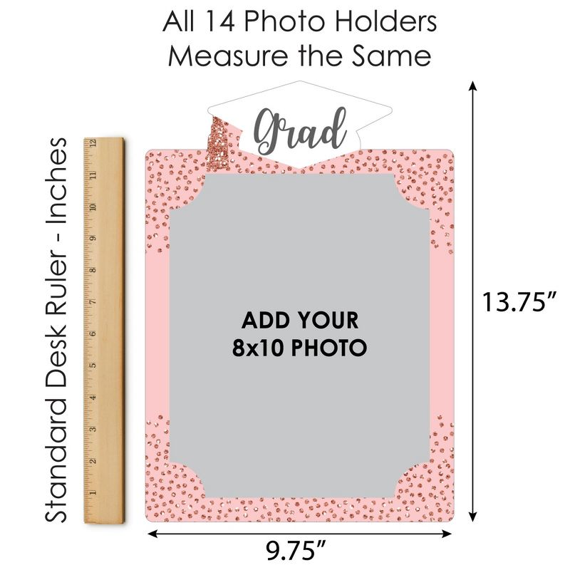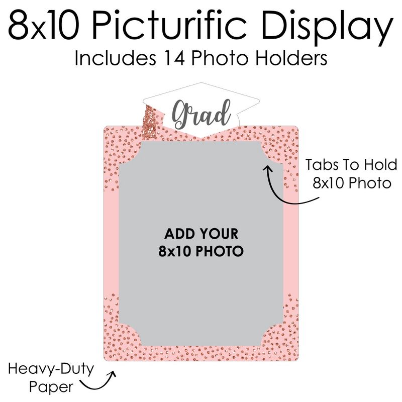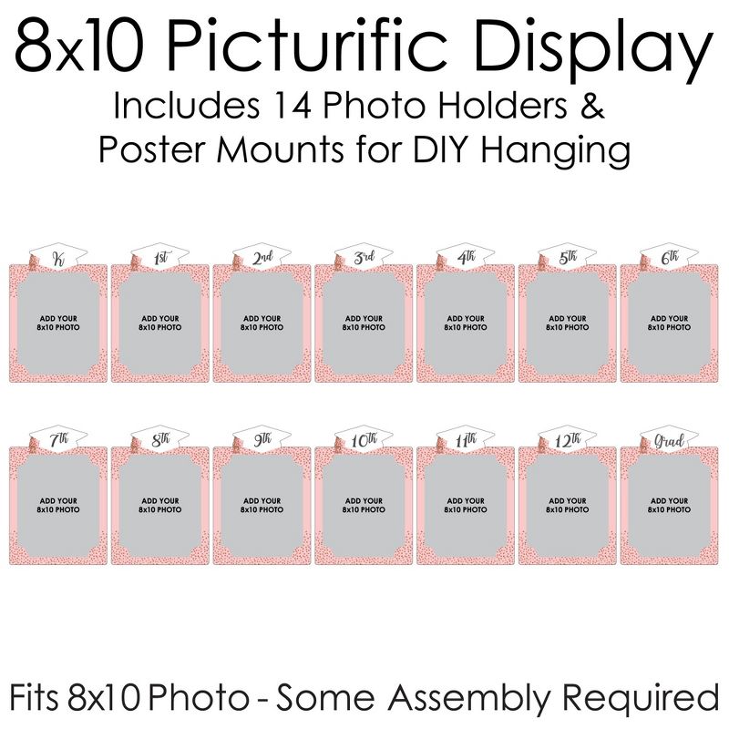 Rose Gold Grad Picturific Display INCLUDES 14 sturdy and professionally printed paper photo holders. Each photo holder has pre-cut tabs to display your 8x10 photos vertically. Non-marking poster wall mounts are included for easy hanging! DIY PHOTO WALL: Show-off your graduate's Kindergarten - 12th grade school pictures with a grand display. Each photo holder has 4 pre-cut slits to tab your 8x10 vertical photos in place. Then hang the completed photo holder frames with the include poster mounts to create a DIY photo wall. FUN GRAD DECOR: Graduation Party DIY Picturific Display is an easy way to decorate for your Rose Gold Grad party. Each Photo Holder is designed with a Grad Cap labeled with a K-12 grade level and coordinating Rose Gold Grad pattern. Arrange the large photo display on a blank wall, over the cake and dessert table, or above the gift table. For a unique grad idea, hang each photo in grade level order to create a path, guiding guests through the party. PREMIUM PARTY DECORATION: Rose Gold Grad Graduation Picturific Display is professionally printed on sturdy cardstock paper. Each photo holder is individually inspected then carefully packaged by hand. Simply add an 8x10 picture to the 14 photo holders. Then the included poster mounts to display as graduation decorations. ASSEMBLY TIP: The poster mounts provided can easily be repositioned, if needed. MADE IN THE USA: Rose Gold Grad Picturific Display is designed and manufactured at our Wisconsin facility using materials that are Made in the USA. Rose Gold Grad DIY Picturific Display uses a No-Mess Glitter Print: Our Photo Holders are designed with a printed image of glitter, eliminating glitter flake while maximizing bling effect!
