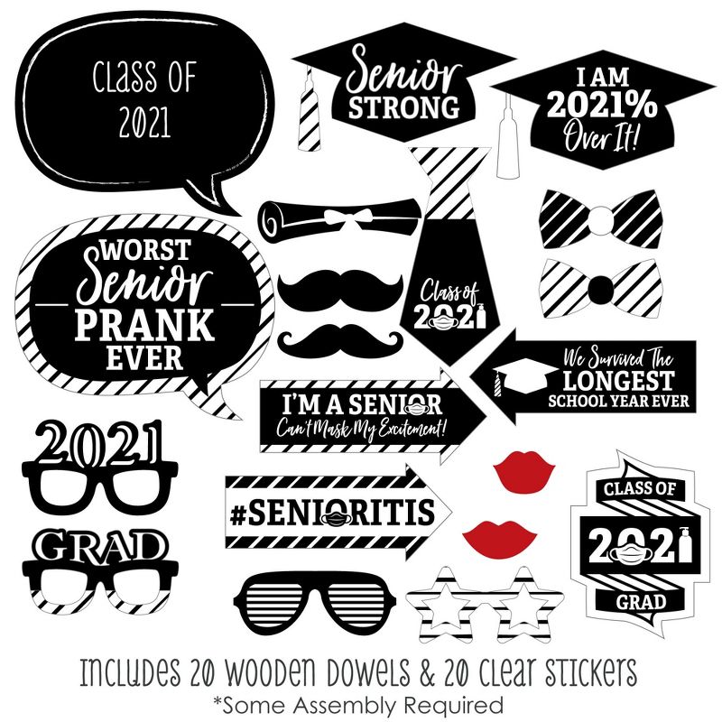 20-Piece Graduation Party Photo Booth Props Kit INCLUDES 20 Senior Strong photo booth props, 20 wooden dowel sticks and stickers for assembly. EASY ASSEMBLY: Simply attach the printed DIY photo booth props to the wooden dowels with included reinforcing stickers. PERFECT FOR ANY CROWD! Photo booth props are fun graduation party supplies for adults and kids - everyone will love the funny faces on these Senior Strong graduation party photo booth props. Take entertaining and shareable party photos of your friends and family while making memories with these funny photo booth props! GRADUATION PARTY DECORATIONS: There are many fun ways to use these cute photo booth props! Use as intended at home, school or work and take party photos to share; add them to vases and floral arrangements as a fun graduation centerpiece; or accent your black and white candy buffet by displaying them in apothecary candy jars! HIGH-QUALITY PARTY SUPPLIES: Senior Strong photo booth props are professionally printed on thick cardstock paper. They will arrive cut out and ready to assemble with the included wooden dowel sticks and stickers. MADE IN THE USA: Senior Strong - Graduation Party Photo Booth Props Kit is designed and manufactured at our Wisconsin facility using materials that are Made in America.