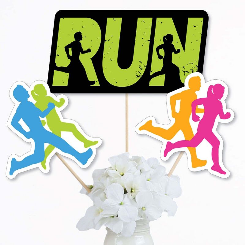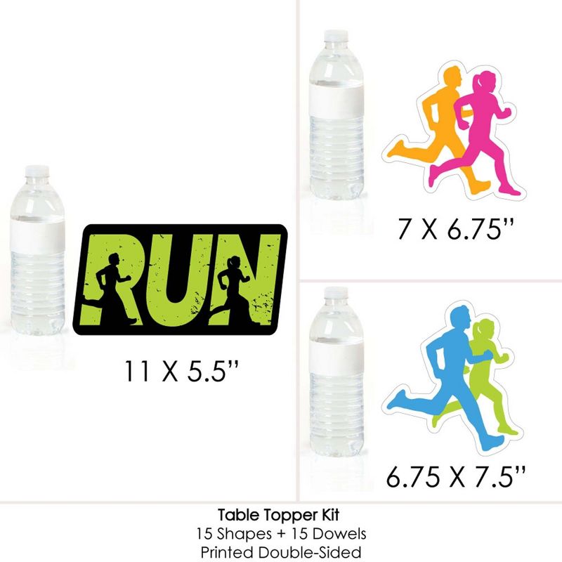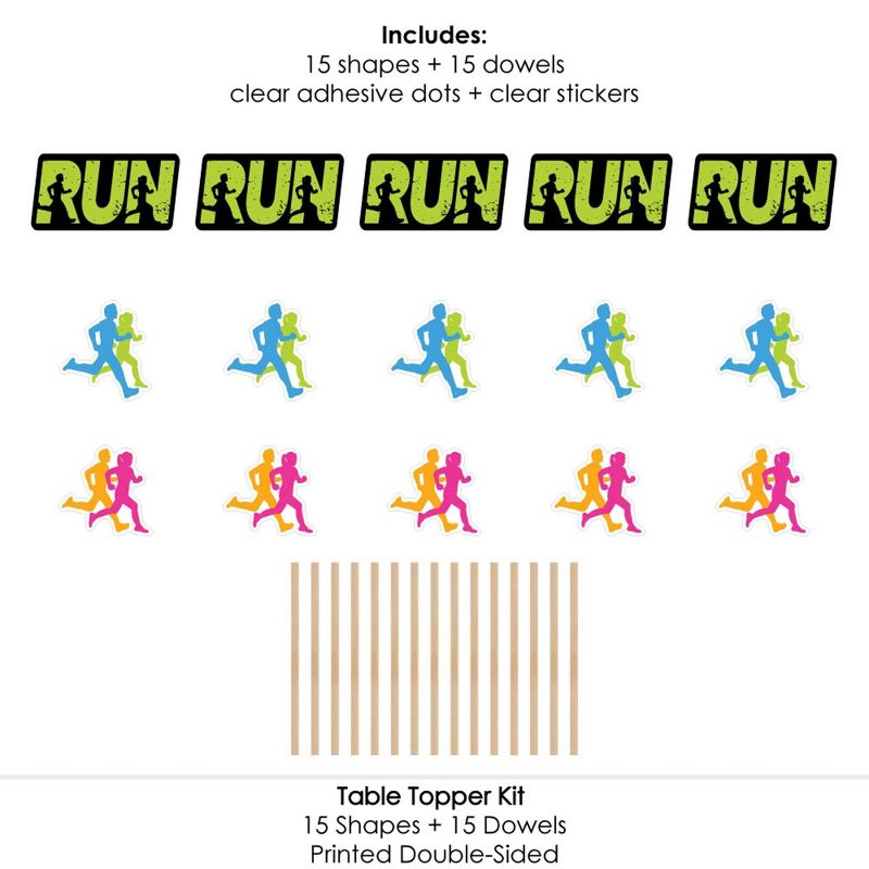Set The Pace - Running Centerpiece Sticks INCLUDES 15 running table toppers in three different shapes, 15 wooden dowel sticks and stickers for easy assembly. Track party table decorations are perfect for a marathon party. Set The Pace - Running Centerpiece Sticks SIZE five run table toppers, 11" wide x 5.5" tall; five runners table toppers, 7" wide x 6.75" tall; and five runners table toppers, 6.75" wide x 7.5" tall. The unique design and variety of pieces makes this table decoration kit an impressive addition to any cross-country theme party. EASY PARTY DECOR: Set The Pace - Running table decorations can be used as centerpieces when attached to the included dowels and inserted into vases or floral arrangements. They easily accent your cross-country party candy buffet when you add them to apothecary jars. Table toppers are also a great addition to any photo booth. The large shaped cut outs will make your party pics instantly shareable. Running centerpiece sticks are sure to make a statement however you choose to use them! PREMIUM PARTY SUPPLIES: Set The Pace - Running table toppers are professionally printed on heavy-duty cardstock paper with a photo-like shine. They are individually inspected and carefully packaged by hand with wooden dowels and stickers for easy assembly. Get creative with your DIY party ideas! MADE IN THE USA: Set The Pace - Running - Track, Cross Country or Marathon Party Centerpiece Sticks are designed and manufactured at our Wisconsin facility using materials that are Made in America.