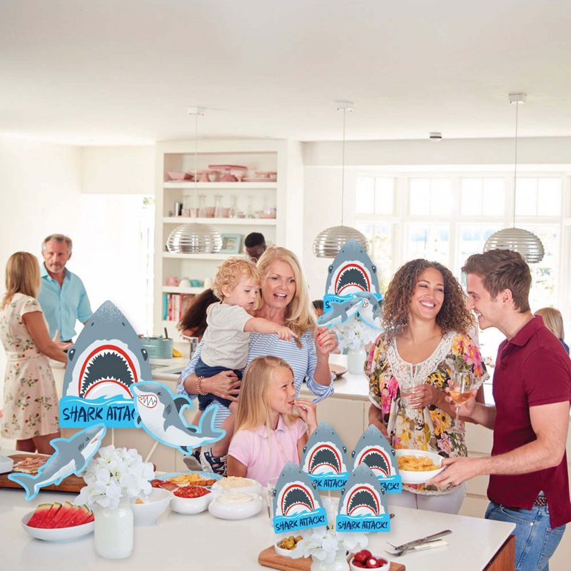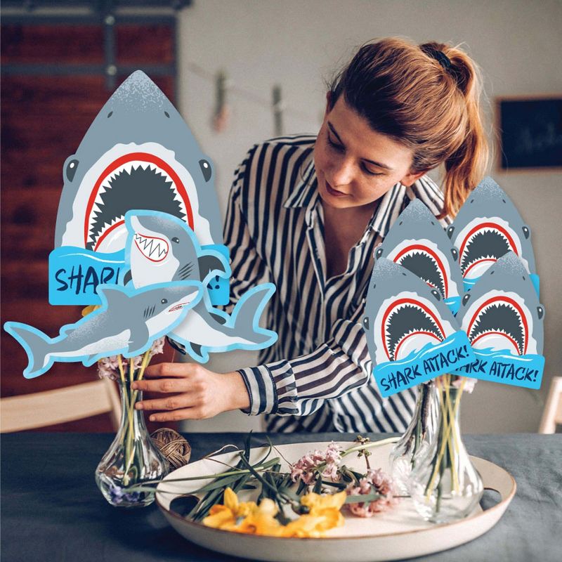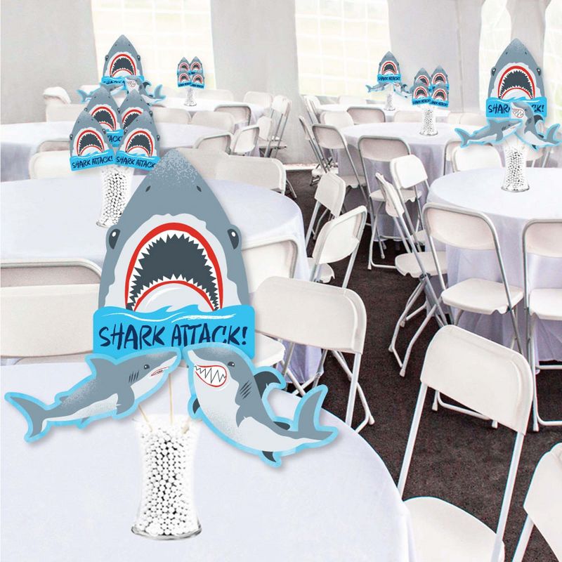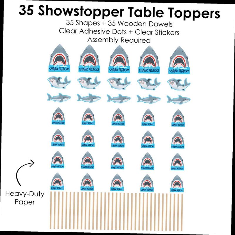 Shark Zone Showstopper Table Toppers INCLUDE: 35 heavy-duty paper centerpiece cut-outs in our Shark Zone theme. Each cut-out shape is printed double-sided and includes 35 wooden dowel sticks. DIY assembly is required. EASY TABLE DECORATIONS: Shark Zone showstopper party centerpieces come with a variety of fun shapes and in the perfect sizes to create impressive tabletop decorations. Place assembled centerpiece sticks into jars or floral arrangements for that showstopper wow-factor. DIY PARTY CENTERPIECES: Shark Zone party centerpiece kit arrives with wooden dowels and reinforcing stickers for easy DIY assembly. Simply press the included reinforcing sticker onto one dowel stick, near the end of dowel. Then, firmly press dowel to the back of a table topper shape. HIGH-QUALITY PARTY SUPPLIES: Shark Zone showstopper table toppers are professionally printed double-sided on sturdy cardstock paper with a photo-like shine. They are individually inspected and carefully packaged by hand. Showstopper table toppers will arrive unassembled, leaving your DIY jawsome shark party or birthday party idea options endless. MADE IN THE USA: Shark Zone showstopper table toppers are designed and manufactured at our Wisconsin facility using materials that are Made in the USA.