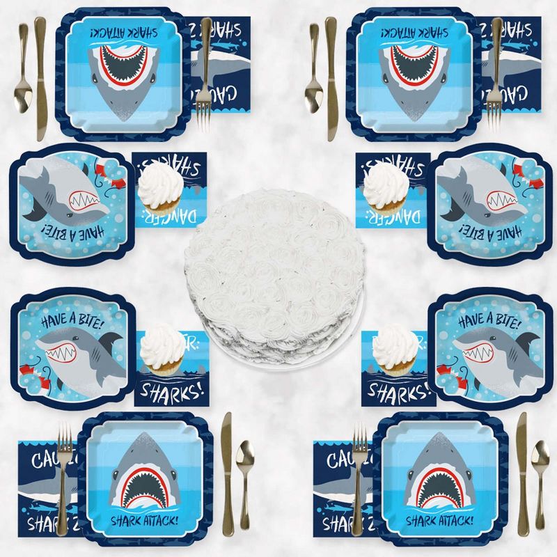Shark Zone Tableware Bundle INCLUDES 16 dinner plates, 16 dessert plates, 16 luncheon napkins and 16 beverage napkins, perfect for serving 16 guests at your Shark Zone party. Shark fin baby shower or birthday party plates are disposable and will make party cleanup easy. COMPLETE TABLEWARE SET! Shark Zone Baby Shower or Birthday Party tableware is a complete set of plates and napkins for a party with 16 guests: 16 Dinner Plates, 9.75 inches x 9.75 inches; 16 Luncheon Napkins, 6.5 inches x 6.5 inches; 16 Dessert Plates, 8 inches x 8 inches; 16 Beverage Napkins, 5 inches x 5 inches. EASY TABLE DECOR: Shark Zone party tableware looks fabulous when you set each dining table. Or, use them at your buffet table and dessert table to bring the party theme to all areas of your event. The dinner plates and napkins large size make meal service easy while the dessert plates and beverage napkins will ensure a perfectly coordinated party. PREMIUM PARTY SUPPLIES: Shark Zone party tableware is created with high-quality materials and designed to withstand any menu. Party plates are printed on a thick cardstock paper and coated, perfect for a variety of food; paper napkins are vividly printed on 3-ply paper so they will look outstanding on your tables or buffet lines. Shark Zone - Baby Shower or Birthday Party Tableware will help you style the perfect tables at your event.