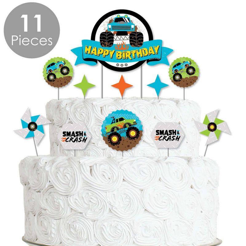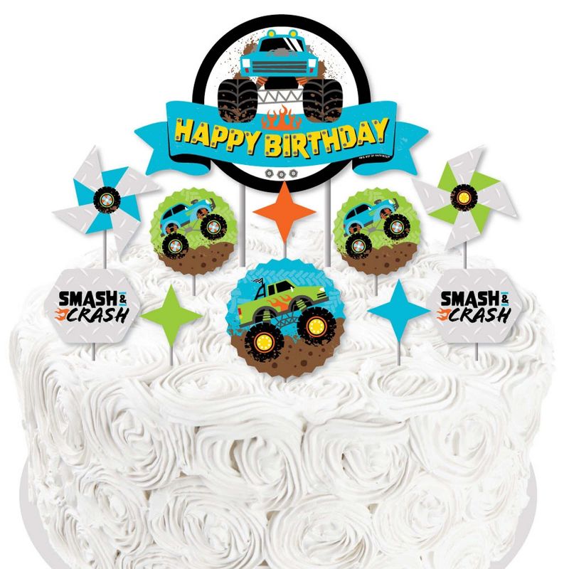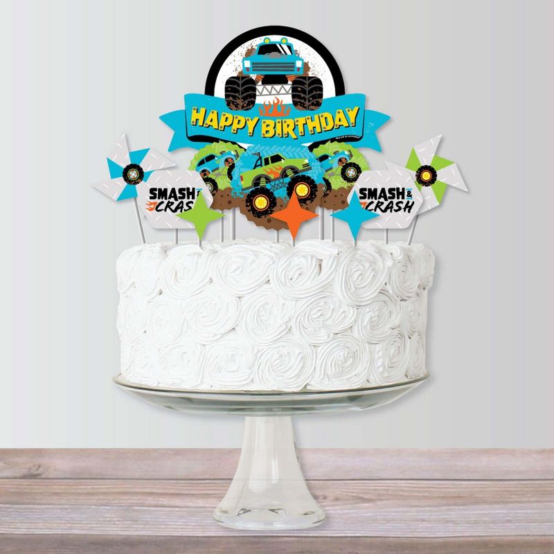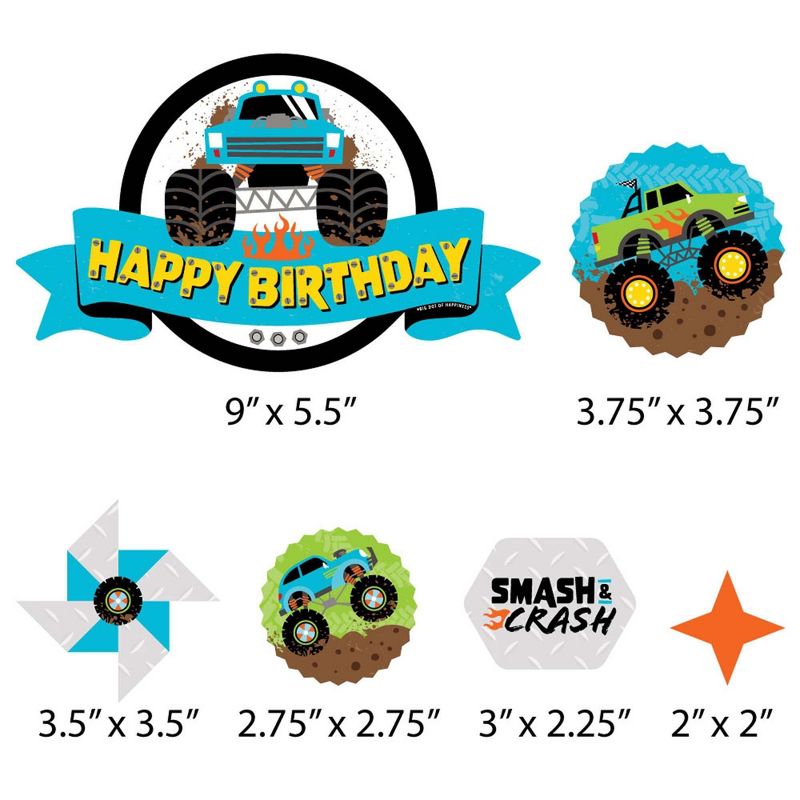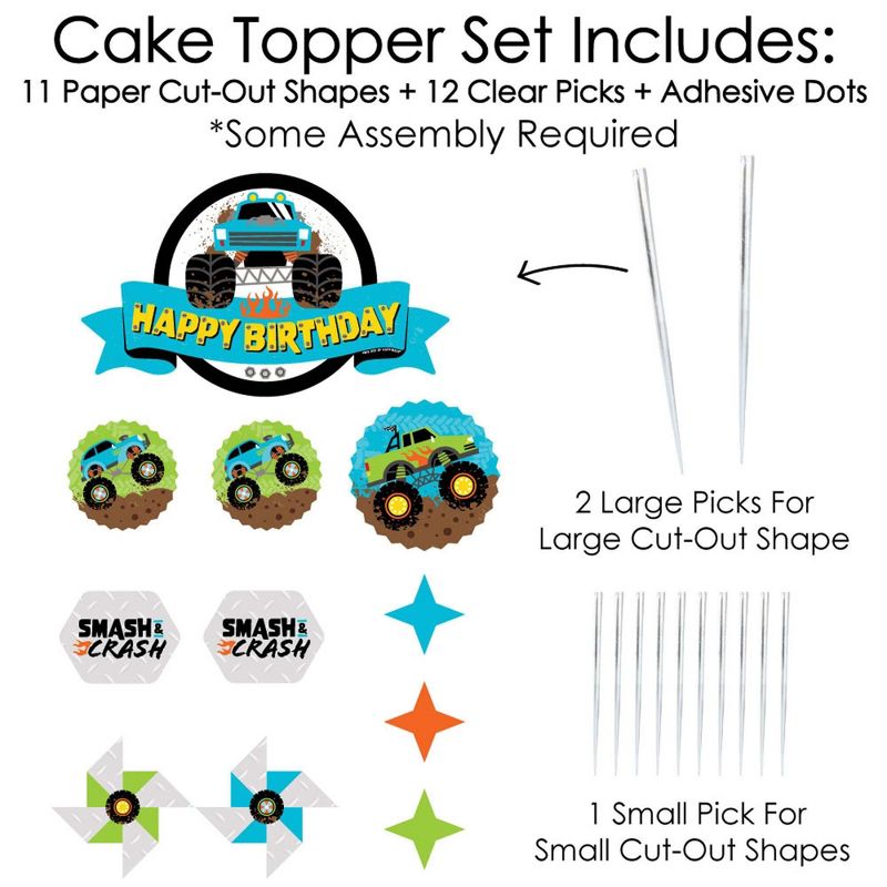 Smash and Crash - Monster Truck Cake Topper Set INCLUDES: 11 sturdy cardstock paper cut-out pieces, 12 clear picks, and sheet of adhesive dots for quick assembly. Some assembly required. CAKE DECORATING KIT: Create an impressive truck dessert table display with this cake topper set. Set includes 12 food-grade plastic clear treat picks. 2 large picks SIZE 6 inches tall for large circle banner cut-out shape. 10 small picks SIZE 4 inches tall for small cut-out shapes. Assembly tip: Plan the arrangement before inserting finished cake topper pieces into the cake. FUN PARTY DECOR: Cake toppers are perfect for any event. Style all decorating pieces for a modern and playful birthday decoration to sit on the top tier of one cake or add small pieces to individual desserts to create fun cupcake toppers. HIGH-QUALITY PARTY SUPPLIES: Smash and Crash - Monster Truck cake toppers are professionally printed one-sided on sturdy cardstock paper. Clear picks are made of food-grade plastic and packaged in a food-safe environment. Cut-out shapes will quickly attach to the clear picks with completed height of each topper depending on where the plastic pick is attached to the shaped cut-out. Please Note: Cake toppers are paper and should not be placed near burning candles. EASY ASSEMBLY INSTRUCTIONS INCLUDED: Smash and Crash - Monster Truck shaped cut-outs are designed and manufactured at our Wisconsin facility using materials that are Made in the USA. Easy assembly instructions will arrive with cake decorating kit.