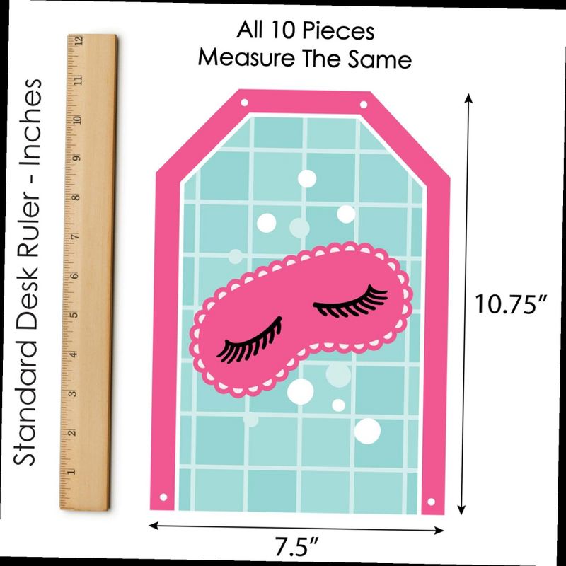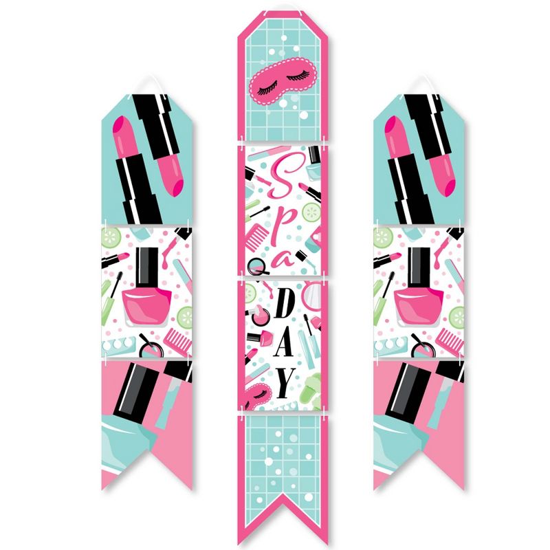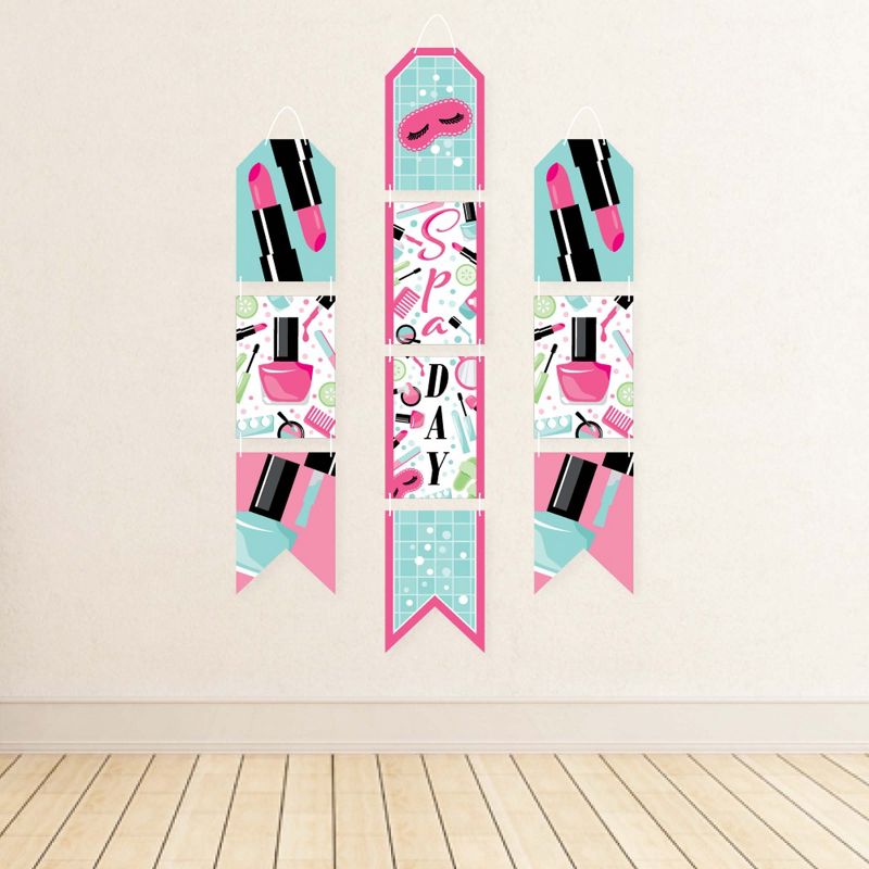 Spa Day Indoor Door Decor INCLUDES: 10 heavy-duty paper pieces to create 3 vertical banners and 10 yards white 2mm satin cord. Easy assembly required. FUN PARTY BANNER: Vertical hanging door banners will create that wow-factor at your girls makeup party. Hang at the entrance of your event, over the food or gift table, or any open wall space to create a fun focal point. WALL DECORATION KIT: All banner sign pieces SIZE 7.5 inches wide x 10.75 inches. Each piece has pre-cut holes for easy DIY hanging with the included 10 yards of white 2mm satin cord. This DIY banner decor kit allows you to choose the spacing between each piece and string the cording through at your desired length. Clear adhesive stickers are also included to secure cording onto the back of each banner piece. PREMIUM PARTY SUPPLIES: Spa Day hanging vertical door banner decoration pieces are professionally printed one-sided on heavy-duty cardstock paper. Each banner piece is individually inspected and carefully packaged by hand. Pamper wall decoration kit requires some easy assembly. Follow the number sequence on the back of each banner piece and simply string the included cording through the pre-cut holes. MADE IN THE USA: Spa Day paper door banner decoration kit is designed and manufactured at our Wisconsin facility using materials that are Made in the USA.
