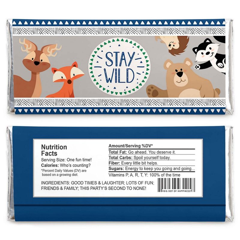 Stay Wild - Forest Animals Standard Candy Bar Wrapper Kit INCLUDES 24 chocolate bar wrappers and 24 foils, perfect for styling an adorable woodland creatures candy buffet or unique Wild One baby shower or birthday party favors. Stay Wild - Forest Animals candy bar wrappers MEASURE 5.25 inches wide x 6.25 inches high and will quickly add the Stay Wild - Forest Animals party theme to all your sweet treats. It is easy to wrap Hershey's® standard sized candy bars with these woodland creatures paper wrappers and foils! EASY PARTY DECORATIONS: Decorated Stay Wild - Forest Animals candy bars are an easy baby shower or birthday party favor to gift all your guests. Set a decorated candy bar at each place setting, package in small gift bags as a party favor or display in a pretty bowl at your candy buffet. Get creative with your forest friends DIY baby shower or birthday party decoration ideas! PREMIUM PARTY SUPPLIES: Stay Wild - Forest Animals chocolate candy bar wrappers are professionally printed on heavy-duty paper with a photo-like shine. They are individually inspected and carefully packaged by hand with silver foil wraps. Follow the included instructions to quickly wrap a foil around each chocolate candy bar and then add the printed paper wrapper, securing with tape. MADE IN THE USA: Stay Wild - Forest Animals Candy Bar Wrapper Party Favors are designed and manufactured at our Wisconsin facility using materials that are Made in the USA. Please Note: Candy bars are not included but are available at your local grocery store. Candy bar wrappers will fit standard 1.55 oz chocolate bars.