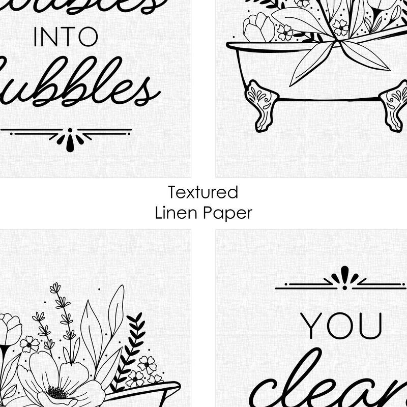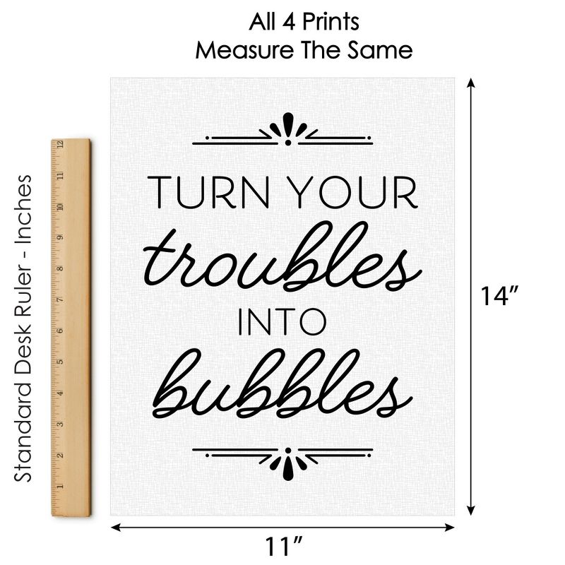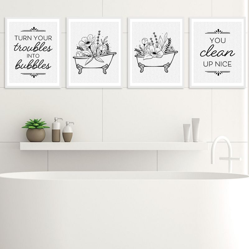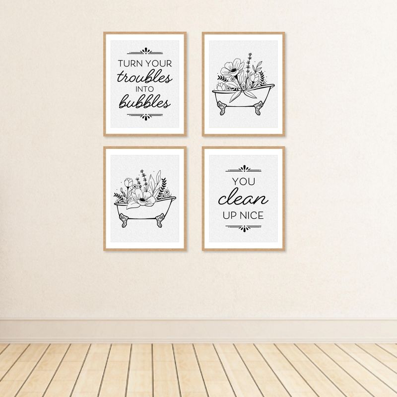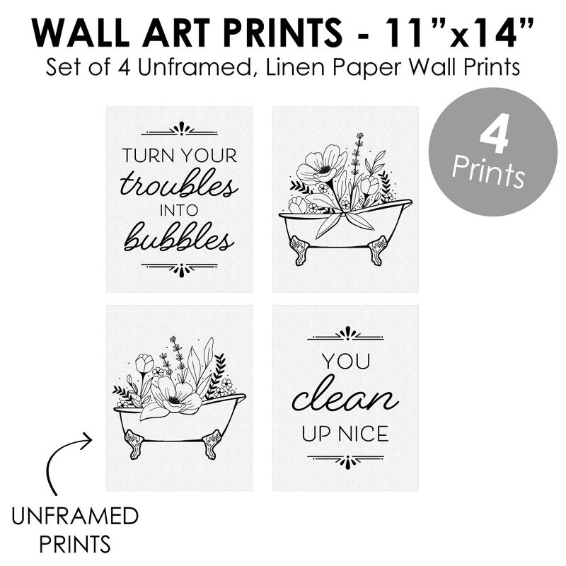Turn Your Troubles Into Bubbles Artisms INCLUDES: Set of 4 linen paper wall art prints. Each print SIZE 11 inches x 14 inches. These 4 unframed prints are perfect home decor for the bathroom. WALL ART SET: Turn Your Troubles Into Bubbles unframed prints are a coordinating set of 4 prints that will give your wall a pulled together look. This set is printed for vertical wall art display. Choose to display as gallery wall set or use each print to style 4 individual moments throughout your home. HOME DECOR: With a mix of typography and art, give your home a contemporary room update with Turn Your Troubles Into Bubbles art prints. This set of 4 bathroom quote prints read: Turn Your Troubles Into Bubbles - You Clean Up Nice. HIGH-QUALITY ART PRINTS: Turn Your Troubles Into Bubbles vertical wall art prints are professionally printed one-sided on textured linen paper. Linen paper gives these inspirational prints a fine finish. Set of 4 wall art prints will come unframed, giving you the creative direction to display how you like. Each linen paper print measures 11 inches x 14 inches. MADE IN THE USA: Turn Your Troubles Into Bubbles linen paper wall art set is designed and manufactured at our Wisconsin facility using materials that are Made in the USA.