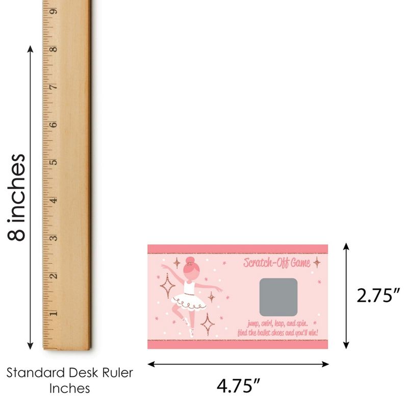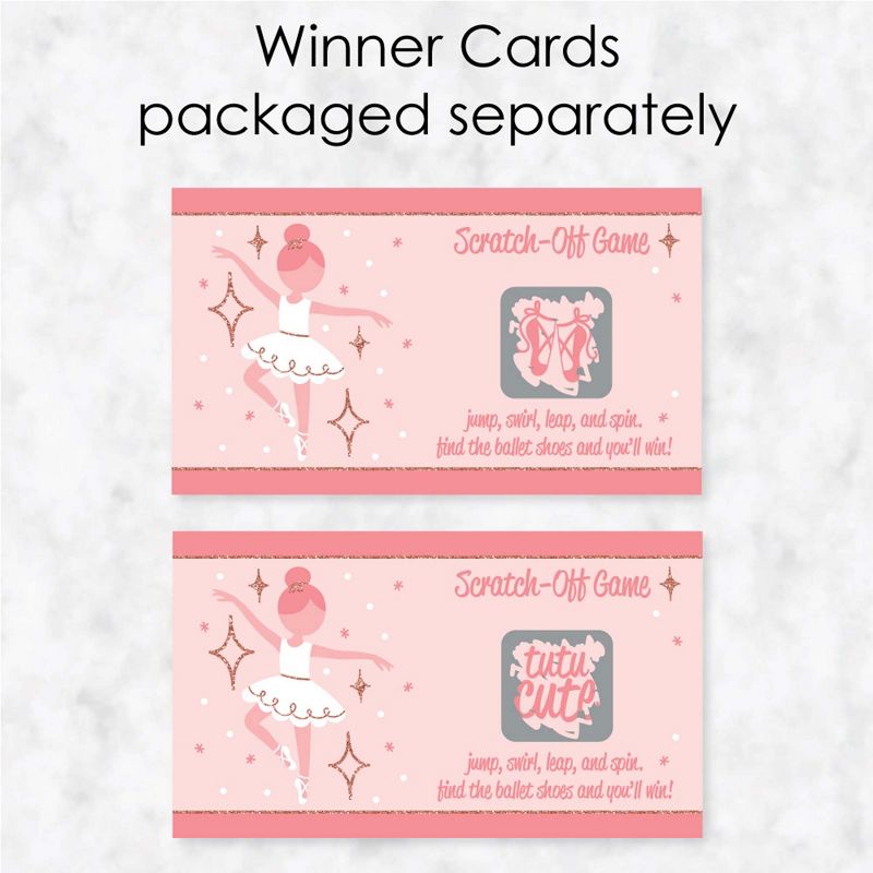 Tutu Cute Ballerina Scratch-Off Cards INCLUDES 22 baby shower or birthday party game cards: 20 "loser" cards and 2 "winner" cards. FUN PARTY GAME: Tutu Cute Ballerina scratch-off cards will be enjoyed by baby shower or birthday party guests of all ages. Each game card measures 2.75" tall x 4.75" wide. Winner and loser game cards are packaged separately so it is easy to pre-select the game winners if you choose. 3 WAYS TO PLAY: Simple - Greet guests as they arrive and hand them a scratch-off card. Quick - Display one scratch-off card at each place setting and have guests play before eating. Favorite - Give scratch-off cards out as mini prizes during other party games. The winning scratch off card(s) gets a grand prize. HIGH-QUALITY PARTY SUPPLIES: Tutu Cute Ballerina Scratch-Off Cards are professionally printed on heavy-duty cardstock paper with a photo-like shine. They are individually inspected and carefully packaged by hand, with winner cards and loser cards clearly marked. This fun baby shower or birthday party game will arrive ready to use at your party. MADE IN THE USA: Tutu Cute Ballerina - Baby Shower or Birthday Party Game Scratch Off Cards are designed and manufactured at our Wisconsin facility using materials that are Made in the USA. We use a No-Mess Glitter Print: Our scratch off cards are designed with a printed image of glitter, eliminating glitter flake while maximizing bling effect!