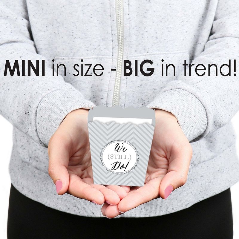 We Still Do Candy Boxes INCLUDES 12 We Still Do anniversary party favor boxes. We Still Do candy treat boxes are perfect for any event. The wedding anniversary theme is great for a wedding anniversary party. We Still Do party favor candy boxes SIZE 2.75 inches tall x 3 inches square at the top. The unique design makes these 12 wedding anniversary favor boxes a must-have for any wedding anniversary party. CANDY BOX PARTY SUPPLIES: We Still Do candy boxes will hold a variety of party food. Fill them with sweet treats or salty snacks. Candies and other goodies will look amazing on your candy buffet with these anniversary favor boxes. PREMIUM PARTY FAVOR BOXES: We Still Do party candy boxes are professionally printed on heavy-duty cardstock paper with a photo-like shine. They are hand-folded and individually inspected, then carefully packaged. Candy boxes will arrive flat, partially assembled. Finishing assembly is required but it is easy. MADE IN AMERICA: We Still Do - Candy Boxes Wedding Anniversary Favors are designed and manufactured at our Wisconsin facility using materials that are Made in America. We Still Do Treat Boxes use a No-Mess Glitter Print: Our candy boxes are designed with a printed image of glitter, eliminating glitter flake while maximizing bling effect!