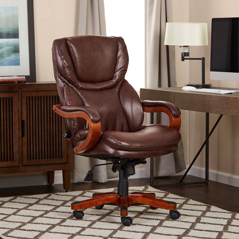 If you're looking for a chair with a powerful, commanding presence, take a look at the Serta Big and Tall Office Chair with Upgraded Wood Accents. Strong, sturdy and dependable, this chair is exclusively designed for strong leaders that need proper support for their larger frames. Its adjustable lumbar panel gives you the support you need for making important decisions and the ergonomic height and tilt adjustment give you the power to find - and lock - the perfect position. When it comes to comfort, this chair is first-class. Layered with thick, pillowy cushions, it's so relaxing, you'll want to order room service. But this chair isn't corporate casual. Made with premium, quality bonded leather, and authentic wood accents, this chair exudes executive presence.