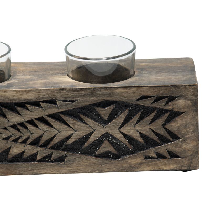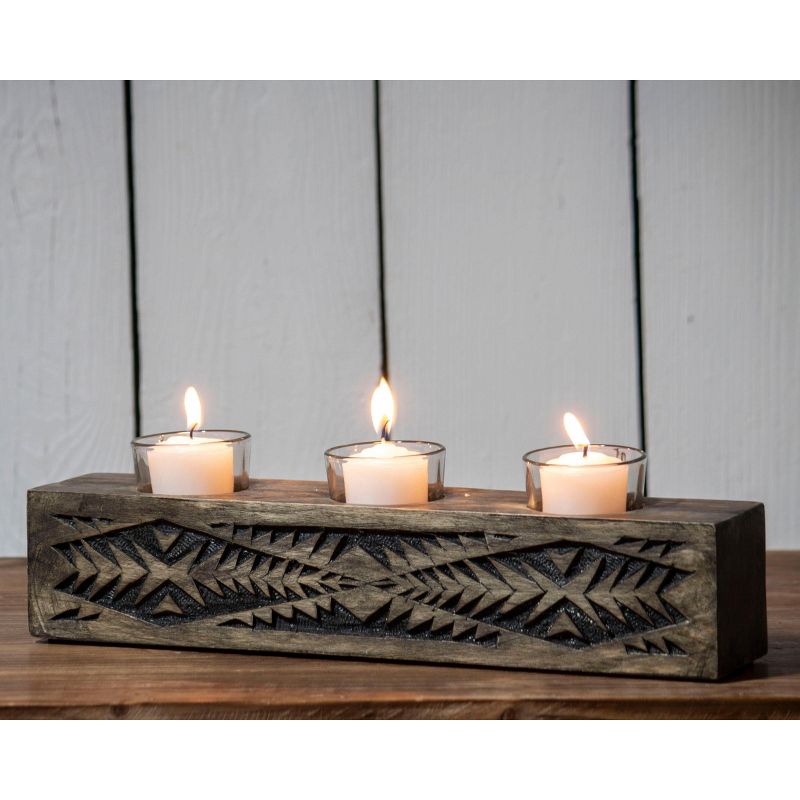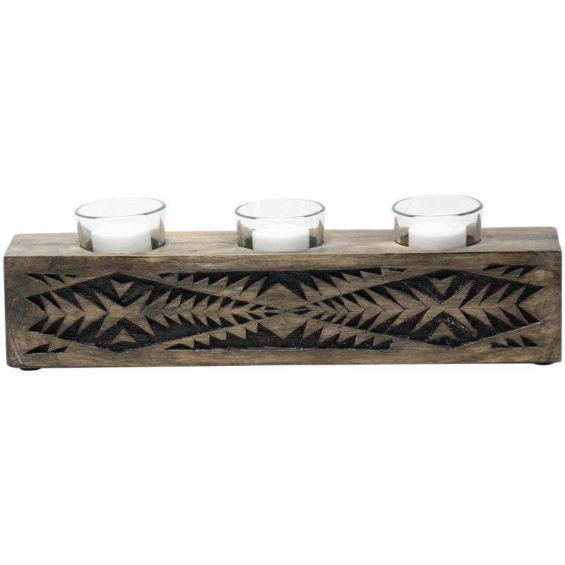 Hand carved, southwestern inspired patterns adorn the black wood Tucson 3 votive Candle Holder with glass inserts. The carvings in the dark mango wood are rubbed with black paint for a bold finish. Three clear glass votive cups allow light to shine through creating a nice, rustic ambience in your home.