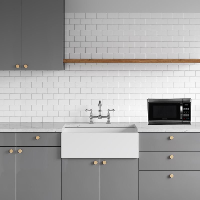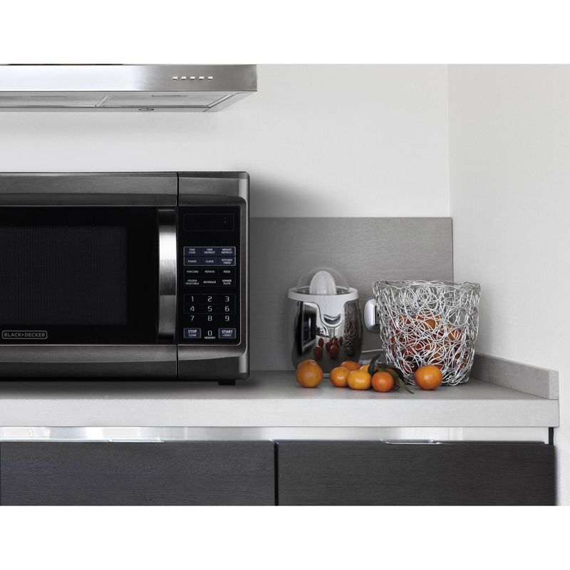 Black + Decker 1.3 Cu. Ft 1000 Watt Microwave Oven - Black Stainless Steel EM034ATC-X. This Black + Decker 1.3 cubic foot Black Stainless Steel Microwave Oven is the perfect solution to your kitchen which gives you fast, even, thourough, and quick cooking options. It features easy-to-use one touch buttons so you can cook baked potatoes, popcorn or even add 30 seconds with the touch of a button. 10 power levels provide the versatility needed to prepare everything from frozen pizza to dinner plates quickly and easily.