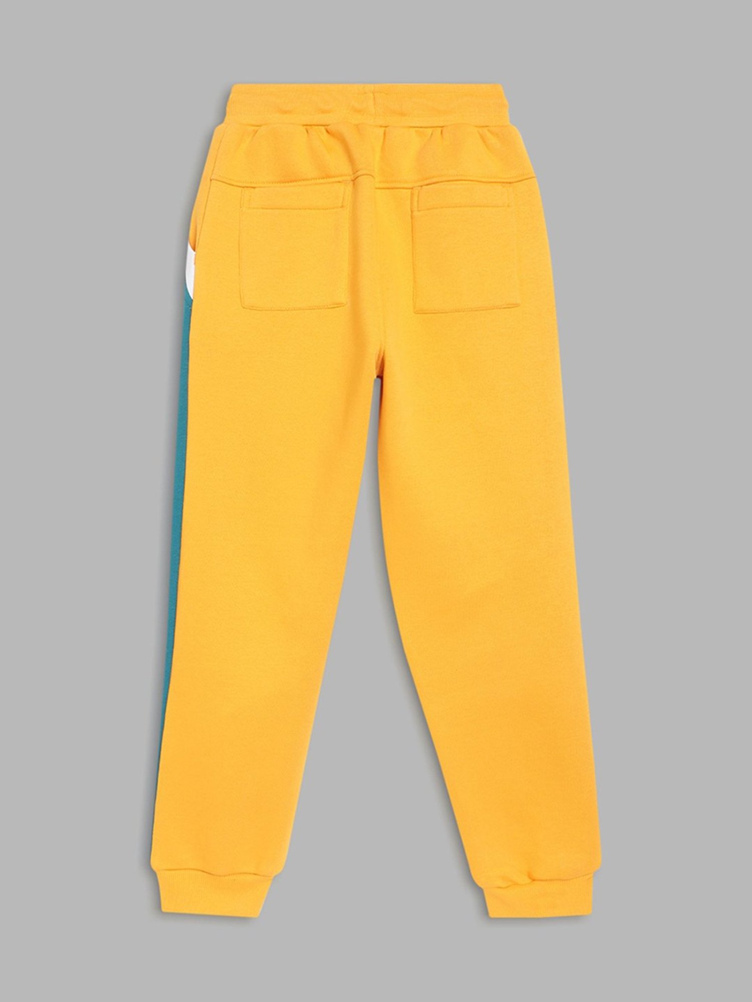 Confer your little kid a stylish makeover with this pair of yellow and teal blue joggers from Blue Giraffe Kids. Tailored to sartorial perfection from premium quality fabric, it assures a soft and soothing touch against the skin. The color-block pattern renders it fashionable. Your little one can team it with a pair of sunglasses for a stylish look.