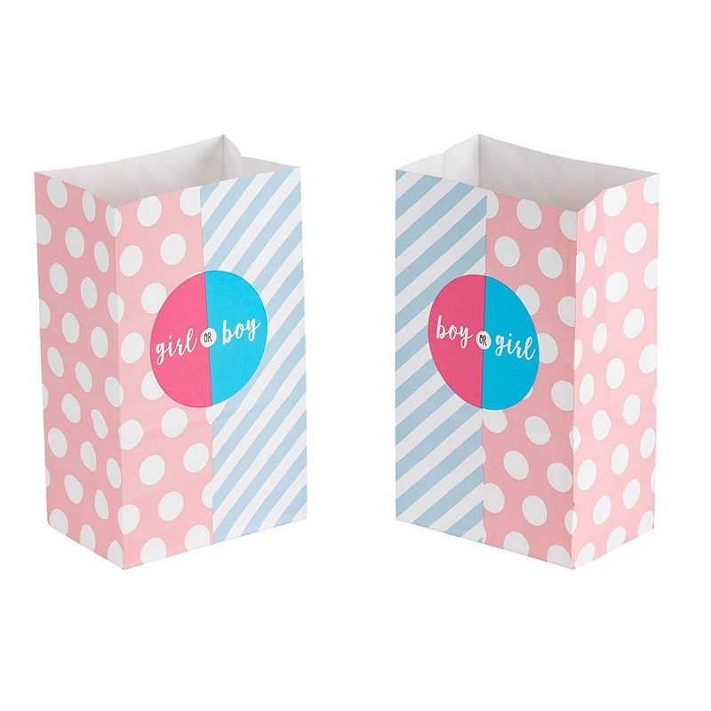 • BOY OR GIRL PARTY TREAT BAGS: Includes 36 paper made goodie bags featuring pink and blue polka dot and stipes pattern, with writing of boy and girl on each border. Each one is perfect for giving out party favors and small gifts