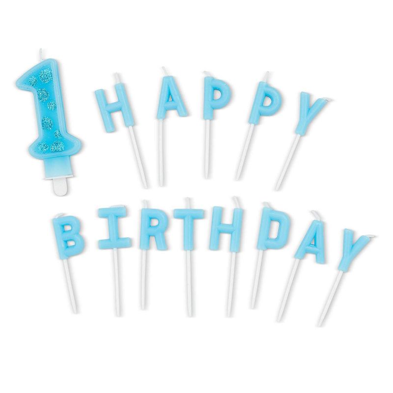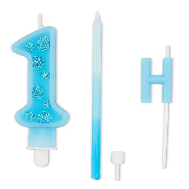 The set includes one “HAPPY BIRTHDAY” and “1” candles & 24 blue ombre metallic thin tall candles, with holders.