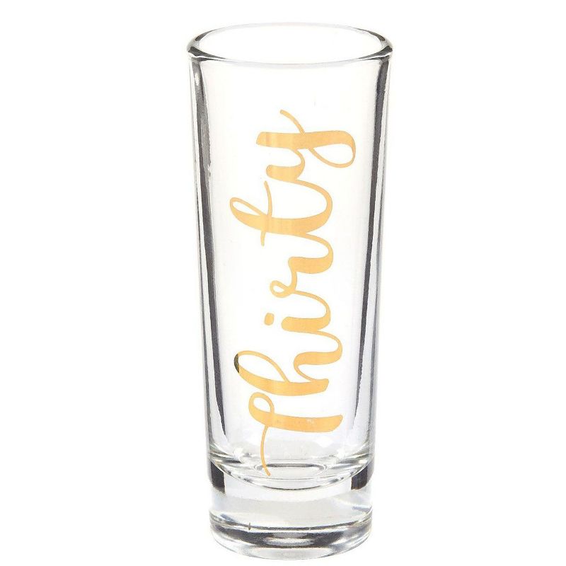• TIME TO CELEBRATE: A pair of happy birthday shot glasses sure to make anyone enjoy the celebration. One glass has Dirty and another has Thirty gold print. The gold cursive writing letters on clear glass are classy and elegant.