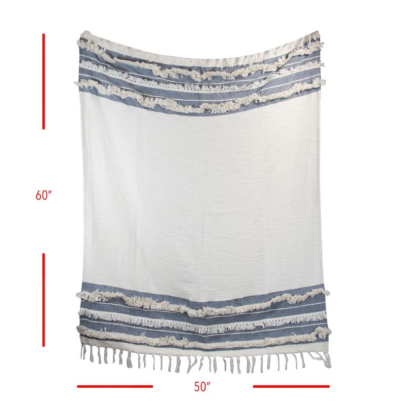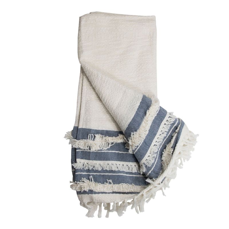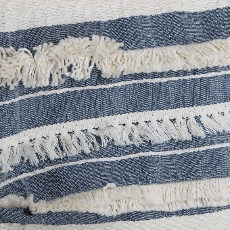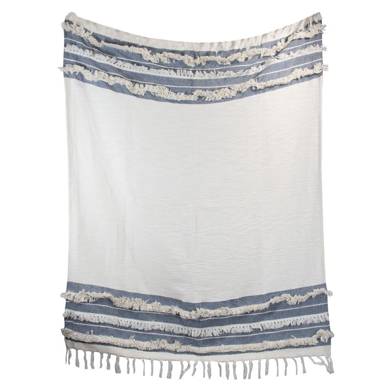 Rest easy in the subtle elegance of the blue striped 50 x 60 inch Milo Throw Blanket from Foreside Home & Garden. The soft white of this throw beautifully blends into denim blue sections. Hand woven by artisans in India, the white woven soft cotton is complemented by shag and tassel fringe trims.