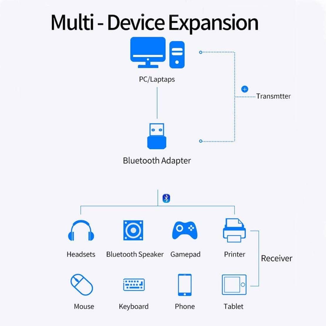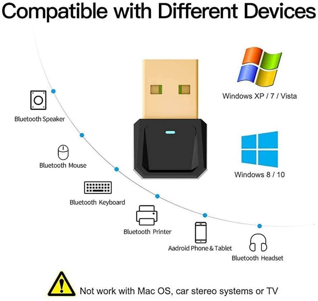 [Bluetooth 5.0 +EDR Chip] Bluetooth USB Dongle adopts Bluetooth standard 5.0 EDR chip, Bluetooth 5.0 adapter has a dual-mode output of receiving and transmitting, ultra-low latency, and will not interfere with other wireless devices. [Support Multiple Devices] Bluetooth USB Adapter can connect the Computer with other Bluetooth-enabled devices, Desktop, Laptop, Mouse, Keyboards, Headphones, Speaker, printer, PS4/X-BOX Handle, at the same time. (Not applicable for Mac OS, Linux, TV, Car Audio/PS4 Host. )[Faster and Stable Transmission] Bluetooth 5.0 adapter is more sensitive and quicker than Bluetooth 4.0, and the maximum transmission rate can reach 3Mbps.