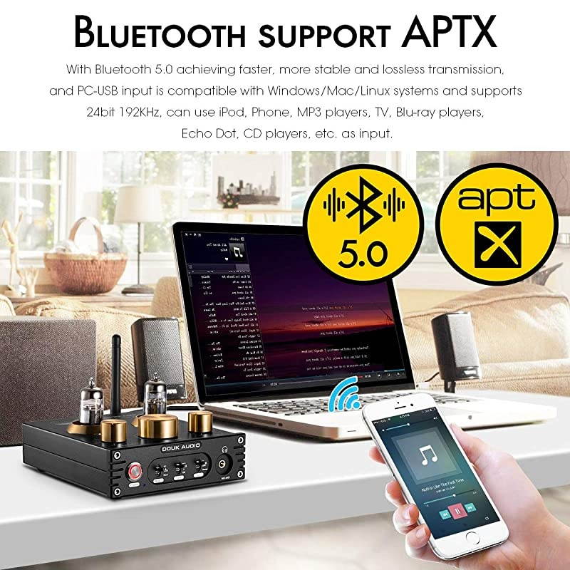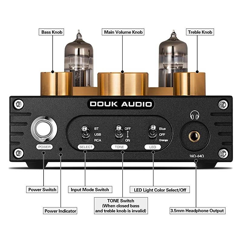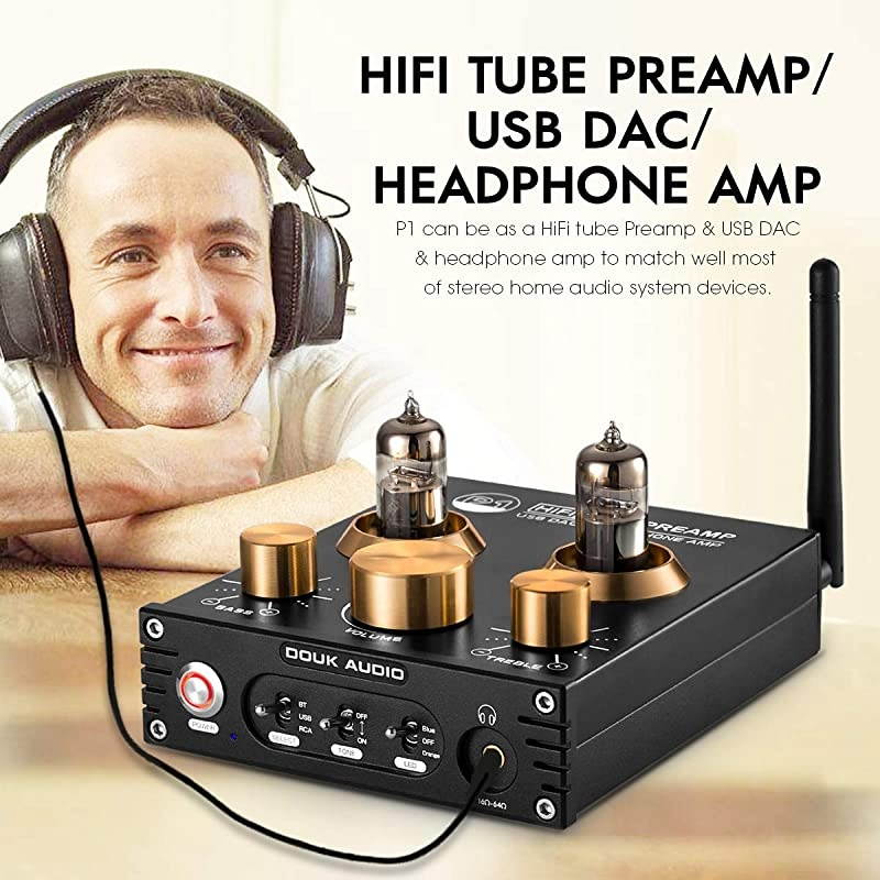 **********is a Bluetooth vacuum & valve tube preamplifier and headphone amplifier. Headphone output is 160mW @32 and is suitable for 32~300 headphones and headsets. *****Classic 6J5 vacuum & valve tube can provide warm retro tube sound. It can be replaced by 6J1, 6J4, GE5654, 6AK5, 61n-EB. *****It supports Bluetooth/USB/RCA inputs from various devices like iPod, Phone, MP3, TV, Blu-ray players, Echo Dot, CD players, computer etc. *****Bluetooth 5.0 supports APT-X, APT-X LL lossless transmission. PC-USB supports 24bit 192KHz and is compatible with Windows/Mac/Linux system*****Treble & bass control can achieve different sound style.