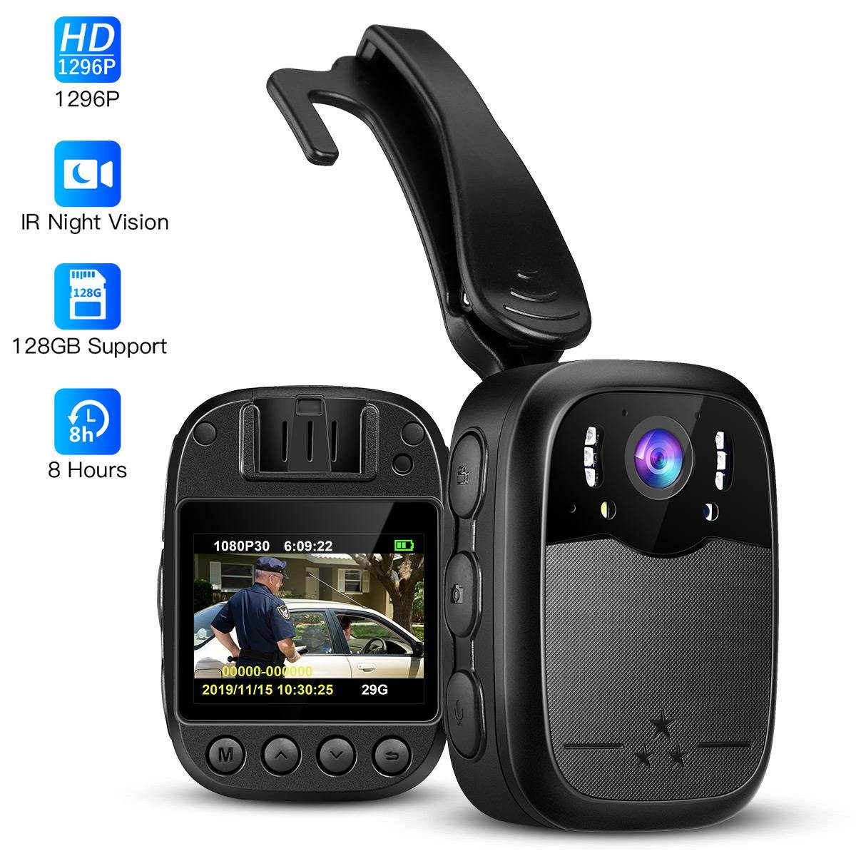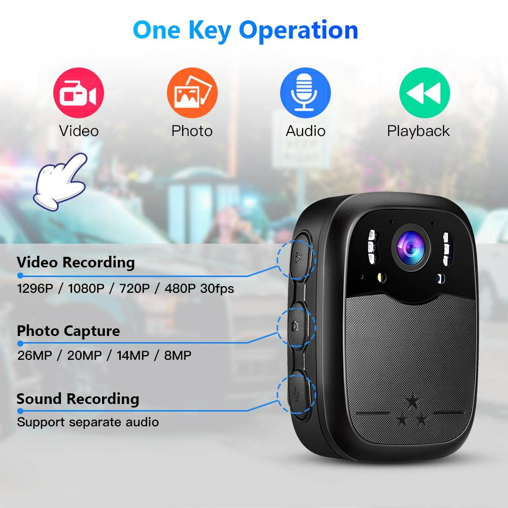 ?: Body mounted recorder for law enforcement with full HD 1296P Video recording and photo audio function. 8X digital zoom and 140 Wide angle allows user to get footage clearly and widely. Support Memory Expand Max 128G (Memory Card is not included). Perfect for police officers, security guards, outdoor enthusiast and other professionals.