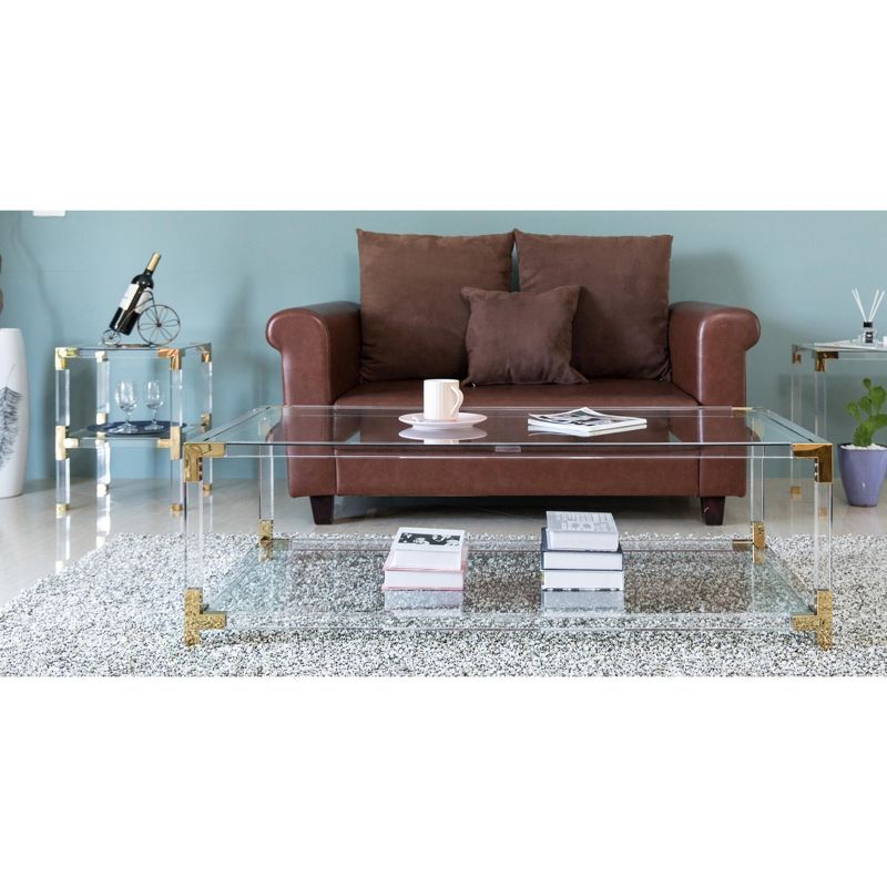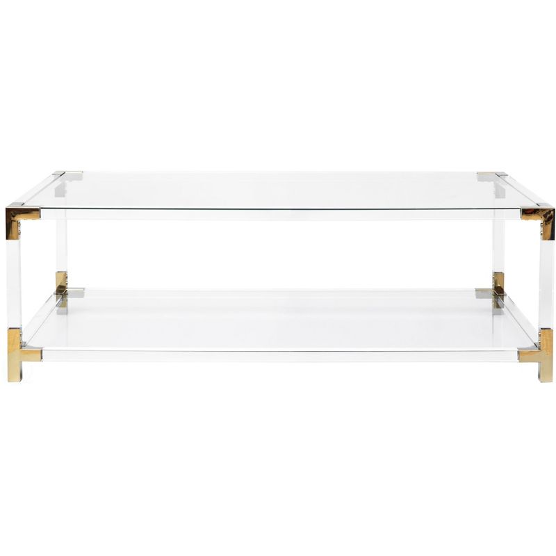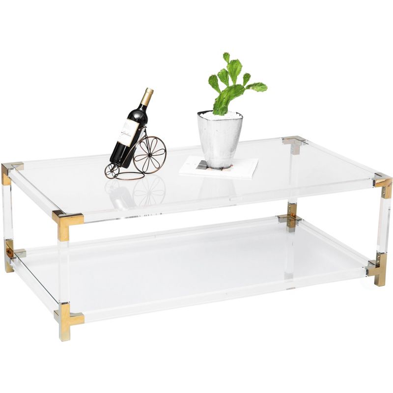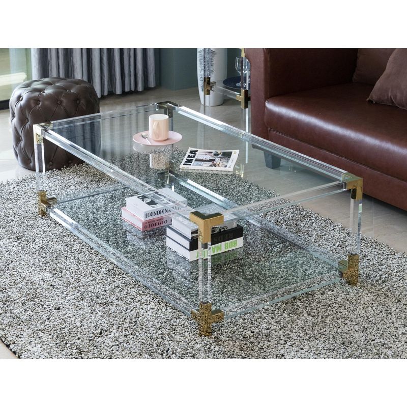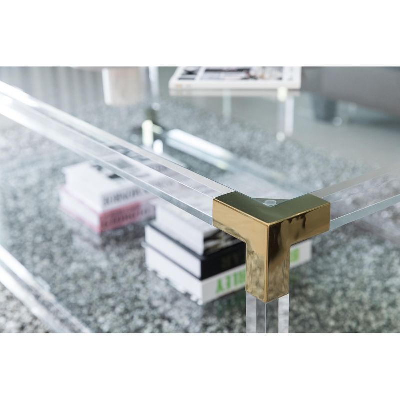 Showcase trinkets and inspire modern glam themes with this acrylic coffee table. Designed with tempered glass shelves, acrylic frame, and gold metal edges, this coffee table offers durable and decorative function for everyday use. Large surface area and bottom shelf allows you to showcase trinkets, plants, and books to keep living room essentials handy. Consider this coffee table for high end living and practical lifestyles.