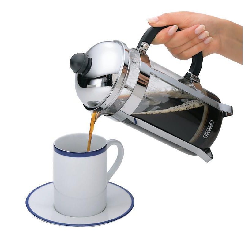 The French press features a sturdy, comfortable handle and an easy-pour spout. A convenient filtering lid feature helps reduce sediment in cups of coffee and espresso drinks such as mochas and cappuccinos. Though top-rack dishwasher safe, handwashing the carafe is recommended to preserve its finish. This glass French press is an ideal partner for BonJour(r) Monet milk frothers and coffee items.