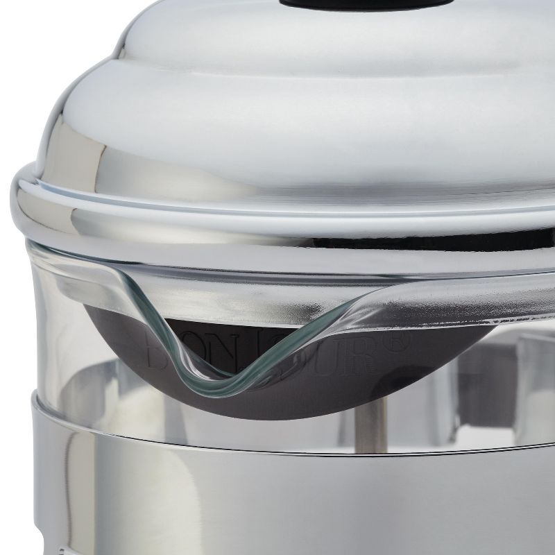Perfect for serving coffee for one to three, this French press is crafted from heat-resistant borosilicate glass and boasts a polished stainless steel frame and gleaming stainless steel high-dome lid. The stylish press brews 50.7 ounces - twelve 4oz espresso-sized cups - of coffee. The patented Flavor Lock(tm) filter system integrated right into the stainless steel plunger allows the brewing process to be stopped in the French press when the desired strength is reached.
