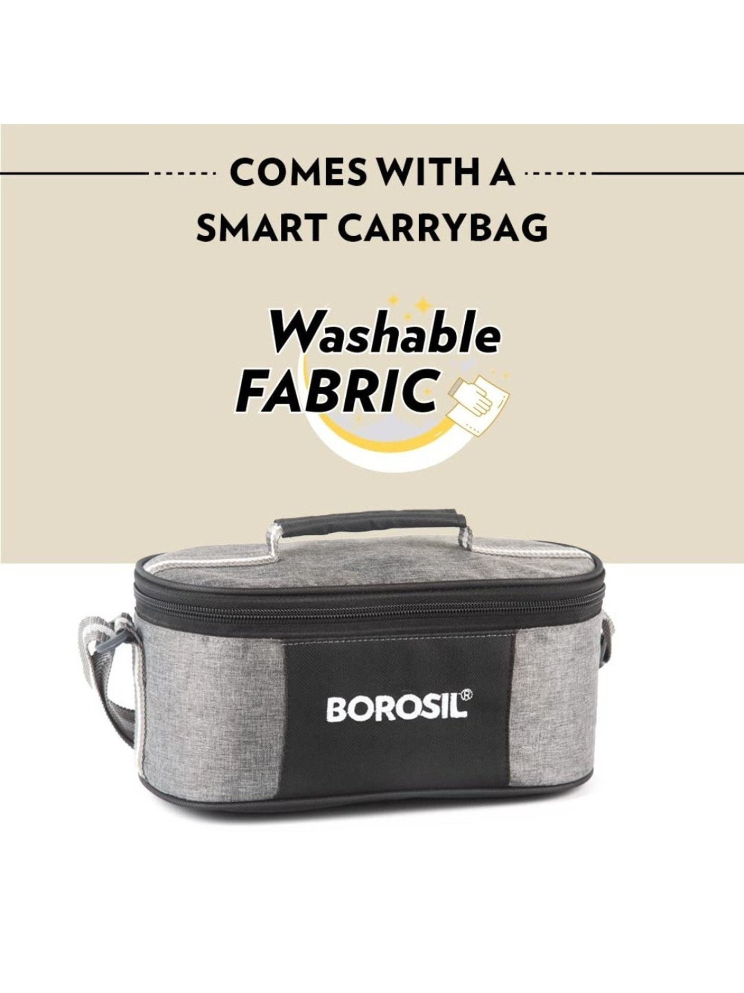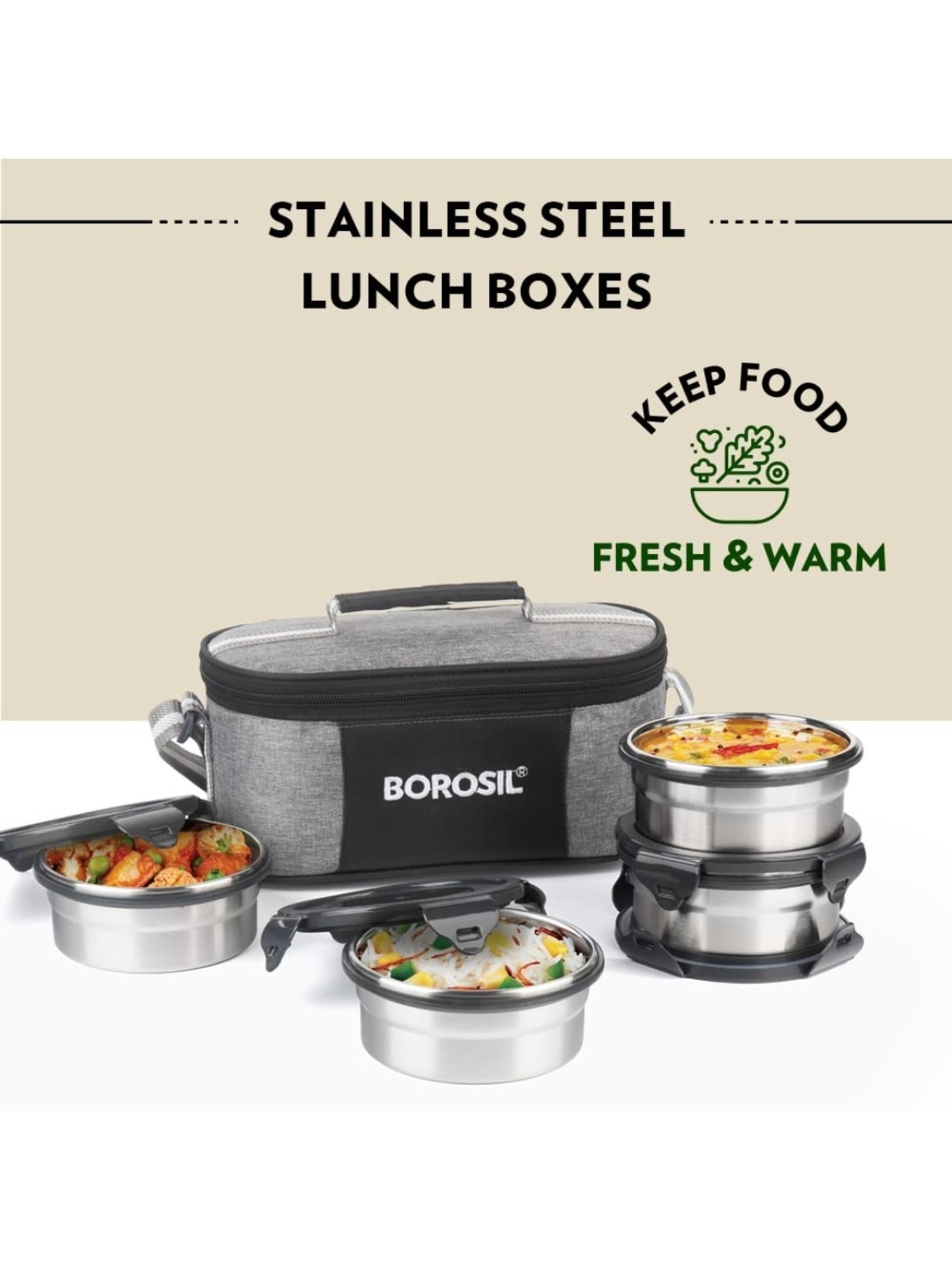 Made from food grade superior quality stainless steel, the lunchboxes keep your food fresh. The stainless steel does not leach any chemicals or react with any food type.SPILL PROOF - No spilled over dal or dirty tiffin base. The insulated tiffins or lunch boxes are completely spill-proof.WASHABLE CARRY BAG - Carry your lunch in a smartly designed bag that's washable.