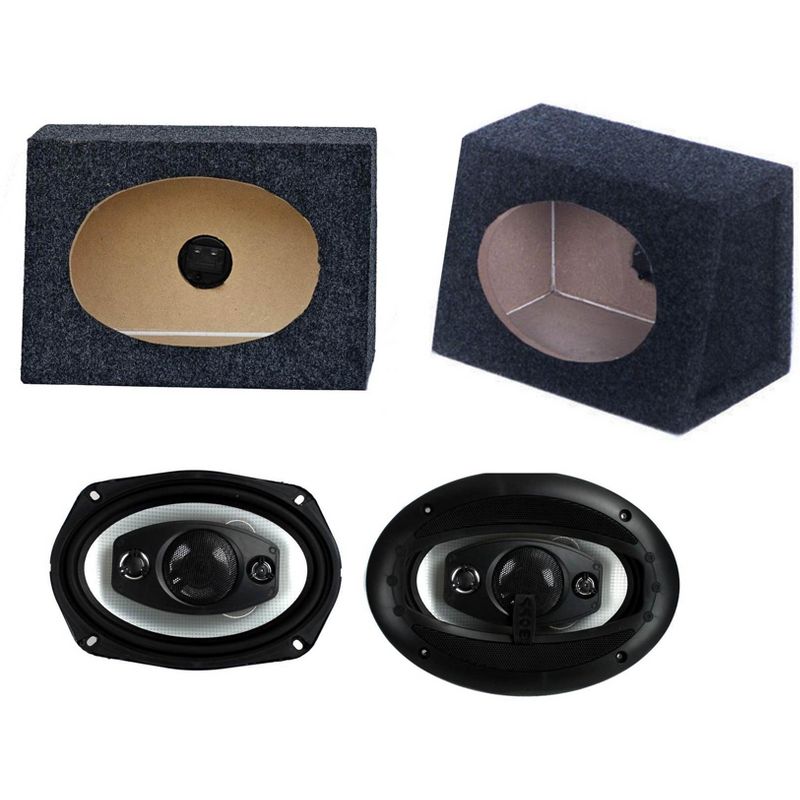 • 2) BOSS **R94** 6x9" 3 Way 500W Car Audio Speakers + 2) Q POWER QTW6X9 Angled Style 6"x9" Car Audio Speaker Box Enclosures