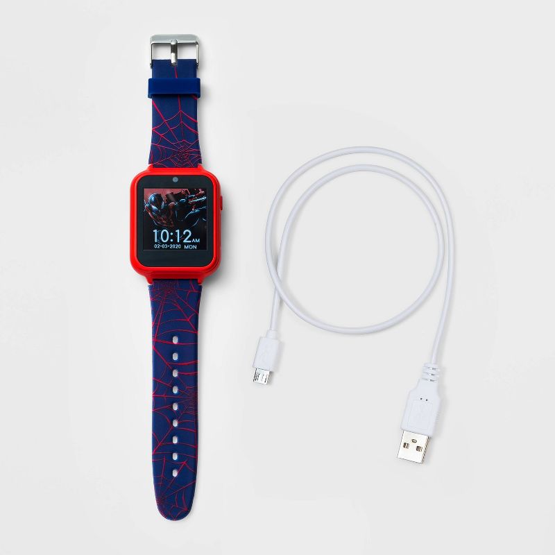 Keep him busy for hours of fun playtime with this Marvel Spider-Man Interactive Watch. Featuring a fun, colorful character design he's sure to love, this blue and red interactive watch is loaded with a camera, fun games and more, making telling time more interactive and fun. The digital display is easy to read and it features an adjustable buckle strap to help him find the perfect fit every time. Plus, the included USB cable and battery-operated design ensures hours of uninterrupted fun. Simply buckle it around the wrist for an easy and fun way for him to keep track of time.