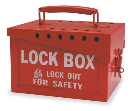 Group Lockout Box, Max. Number of Padlocks 13, Hinged Door Type, Red, Portable Yes, Steel, Height 6 in, Width 7 3/8 in, Depth 9 1/4 in, Wall Mounting No, Legend Lock Box Lock Out for Safety. This item has been restricted from sale in the following state (s): []