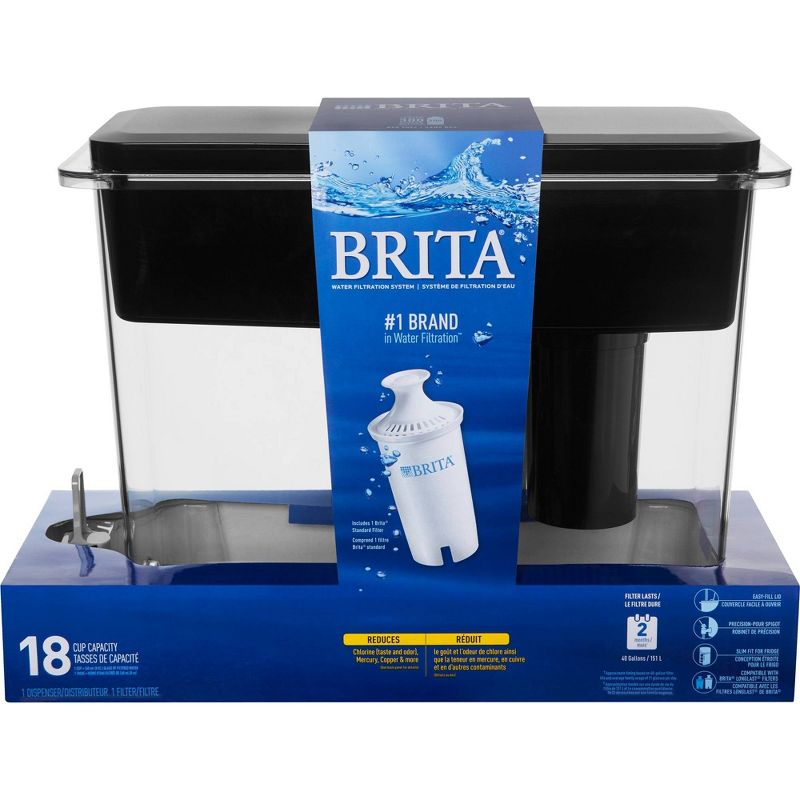 Drink healthier, great-tasting water with this BPA free Brita 18 Cup UltraMax Water Dispenser. The extra large capacity makes this water filtration system perfect for busy families, sports teams and offices, while a new, sleek, space efficient design allows for convenient storage. A flip top lid makes refilling a breeze. Plus, just a glance at the filter indicator lets you know when it is time to change the Brita water filter. This filtered water dispenser comes with 1 water filter and delivers great tasting water in every pour.