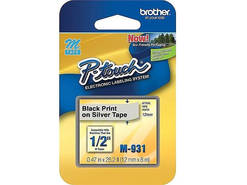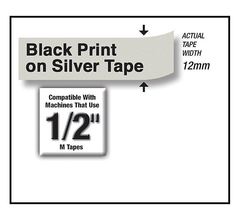 Create attractive labels for indoor use at home, office and school. Best for flat, dry surfaces. Perfect for all custom indoor labeling needs. Label Size - text: 1/2" x 26 1/5 ft.; Label Color(s): Silver; Machine Compatibility: Brother P-Touch PT-65, PT-70, PT-80, PT-85, PT-90, PT-100, PT-110; Printed Text Color(s): Black. Create attractive labels for indoor use at home, office and school. Best for flat, dry surfaces Sold as 1 Each.