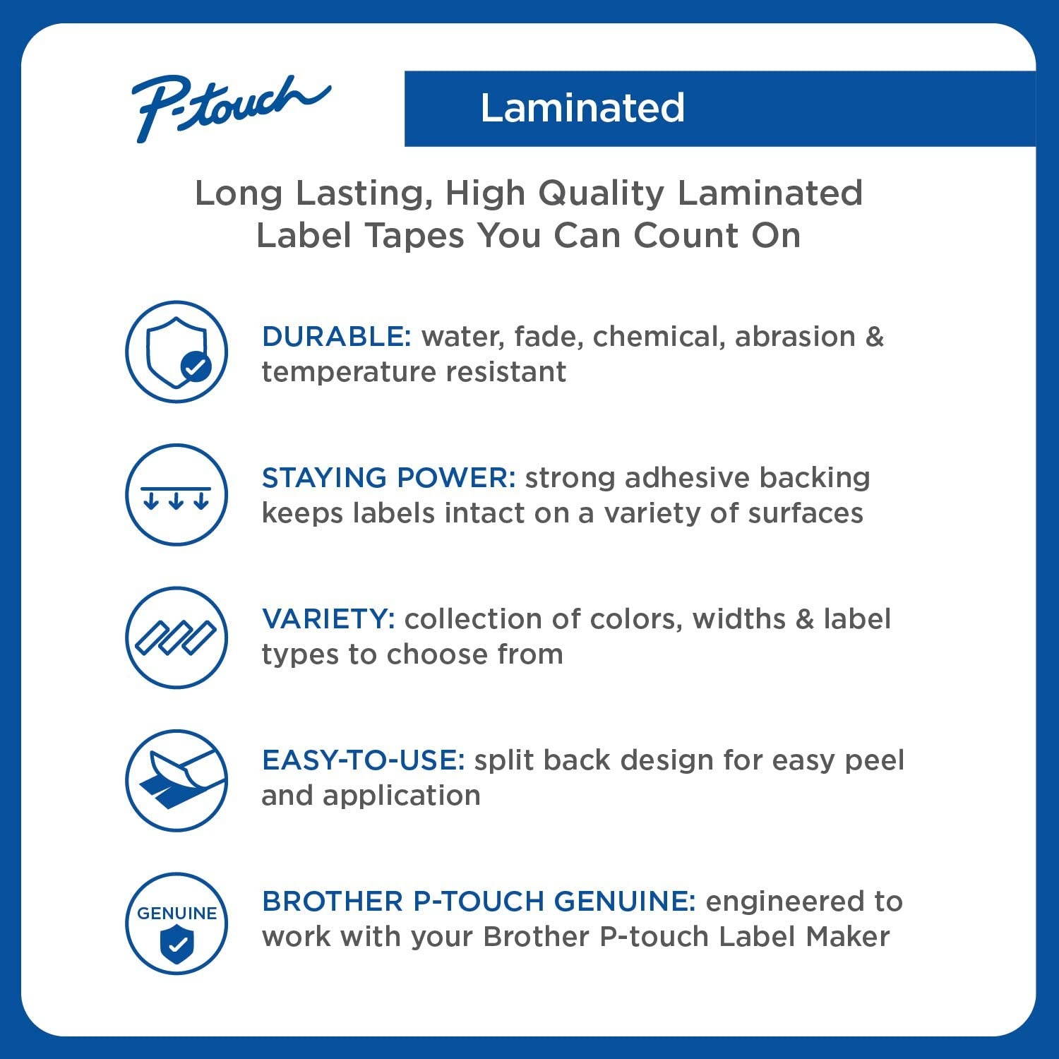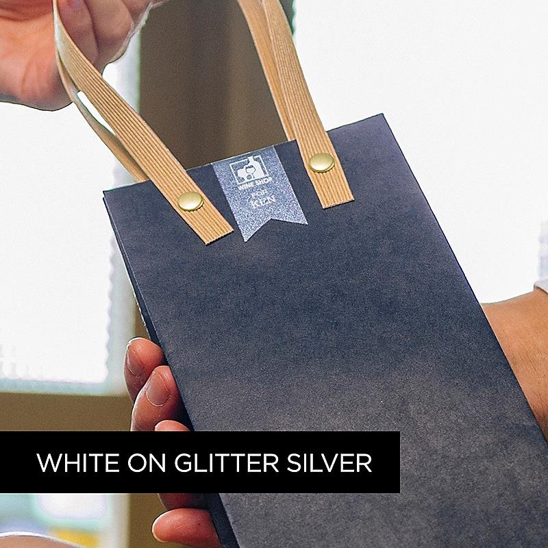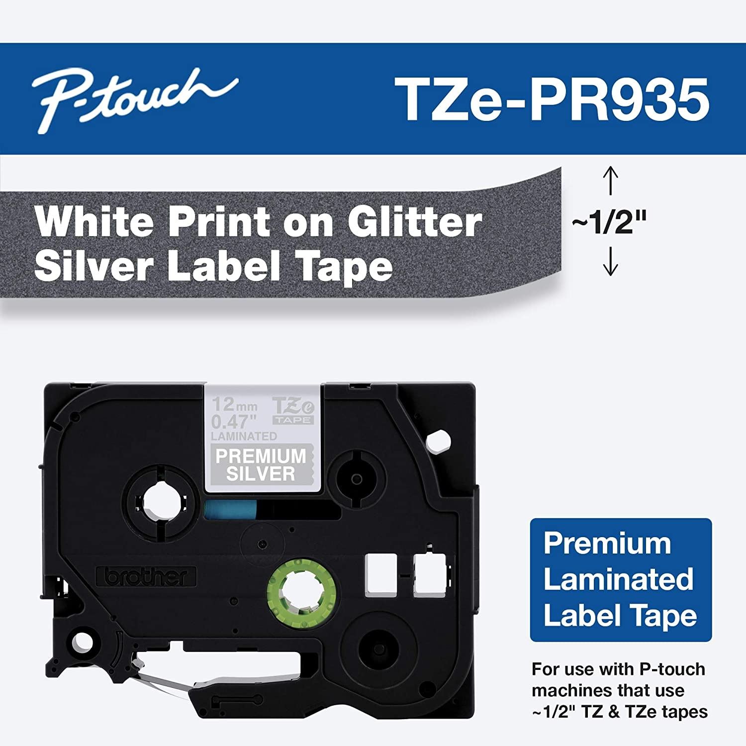 Brother P-touch TZePR935 White Print on Premium Glitter Silver laminated tape is 12mm ( 0.47" ) wide x 8m ( 26.2 ') long and designed to let you add sparkle and pizazz to retail shop, craft-based, home and office labels to make them really stand out. The sturdy laminated adhesive backing sticks easily to a variety of surfaces and the attractive white print on silver glitter design helps to get your labels noticed. P-touch TZe Premium Glitter laminated tapes are made with glitter particles under lamination that add a special sparkle and iridescence to your labels. Create stunning name badges, attractive retail shop, craft, home and office organization labels and add a touch of elegance to gifts and giftwrapping to help make your products and projects shine. This attractive, durable laminated tape is suitable for both indoor and outdoor use and remains securely in place even in hot and cold extreme temperatures.