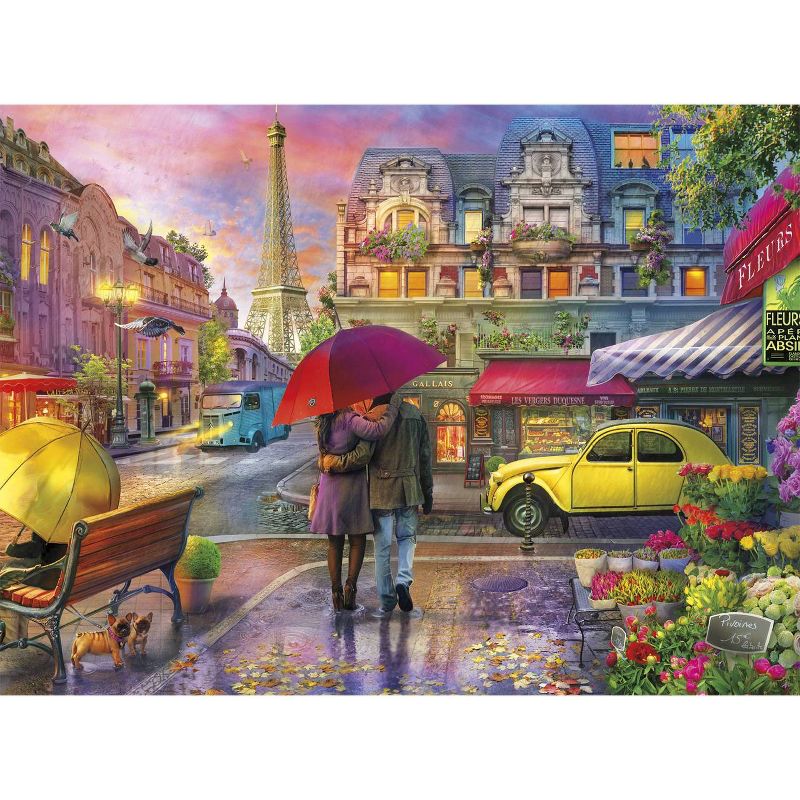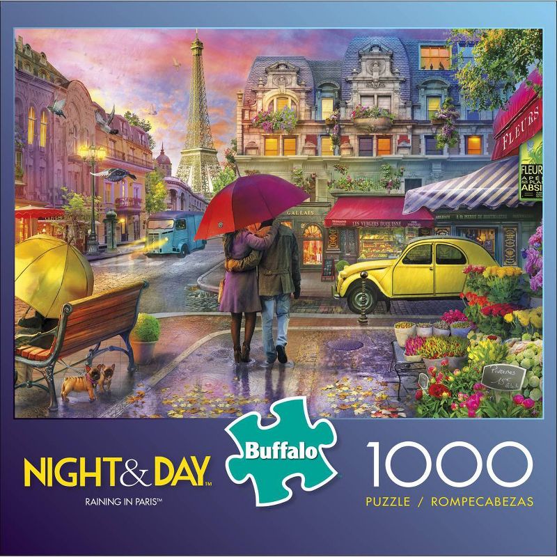 This 1,000-piece puzzle, Raining in Paris, based on the Art of Lillia, is set near the world-famous Eiffel Tower. Under the pink sky of a summer’s night bright-colored umbrellas keep folks dry in town. Two dogs find shelter of their own under a bench as their owner rests on it and a couple walks by the flower shop where yellow, pink, red and purple flowers are for sale. This picturesque scene also captures the beautiful architecture of nearby buildings. This puzzle is part of the Night and Day collection by Buffalo Games