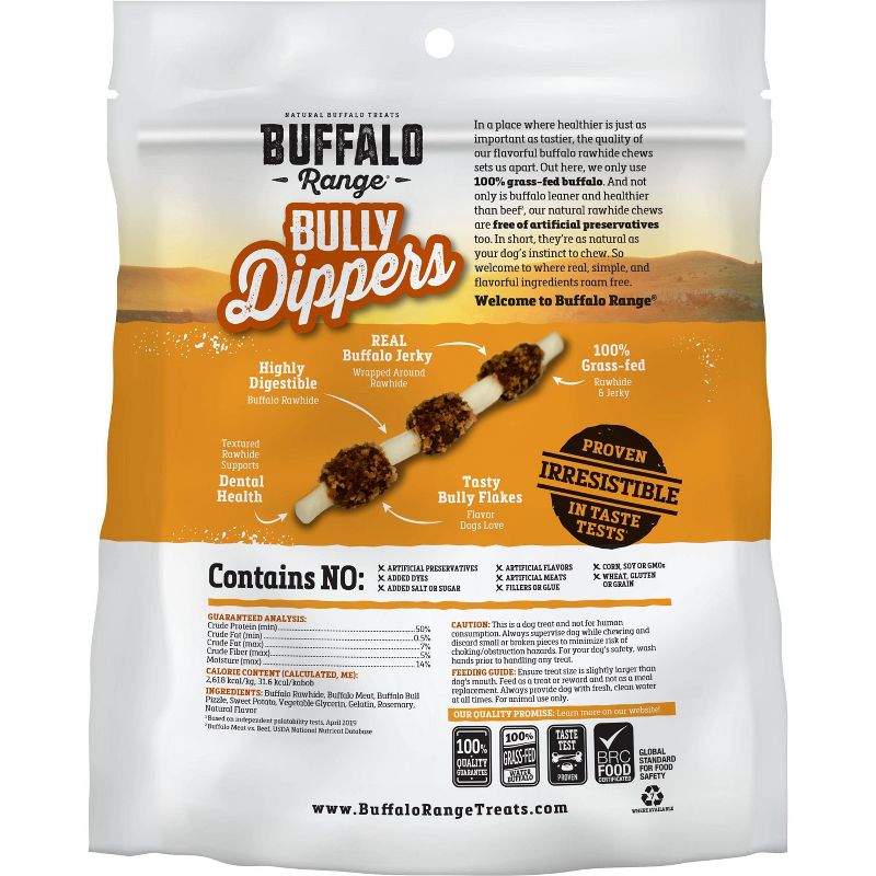 •HEALTHY DOG CHEWS - Buffalo Range rawhides for dogs are a healthy alternative to regular rawhide bones. Bully Kabobs are made with 100% buffalo rawhide, buffalo meat and protein rich bully pieces.