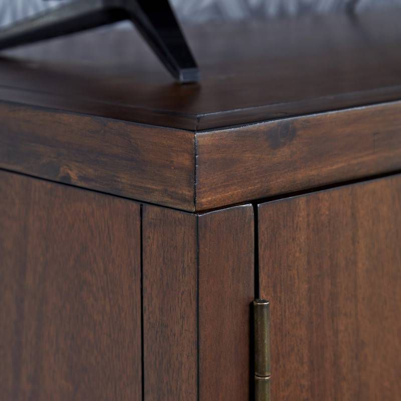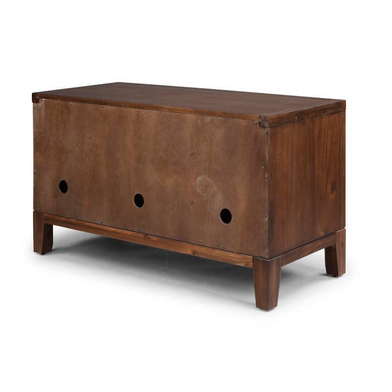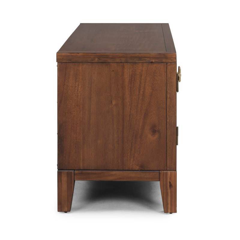 Updated mid-century modern design, fashioned from the west coast architectural design of the small subdivision homes of that era, known as bungalows. Crafted from Acacia wood solids and veneers over engineered woods, finished in a classic mid-century modern medium brown tone.