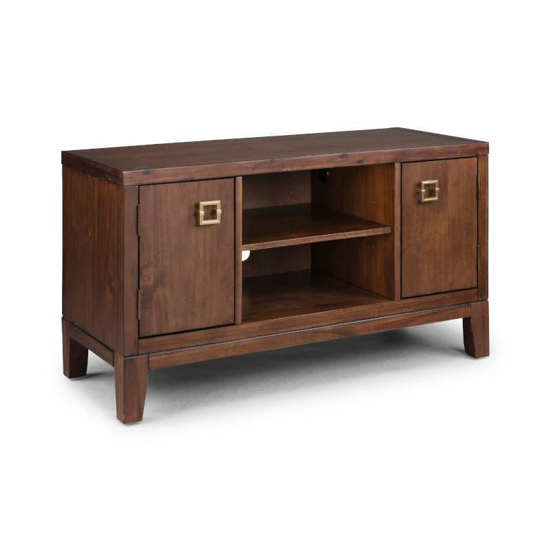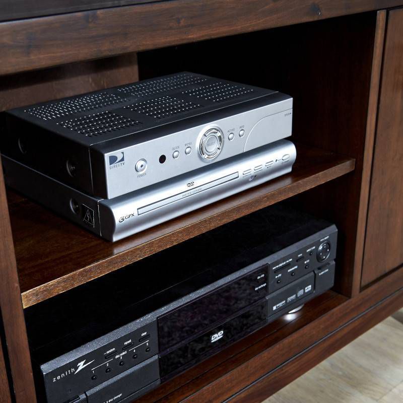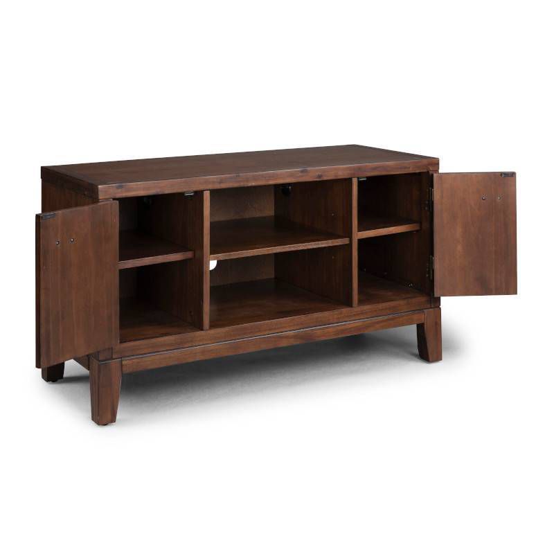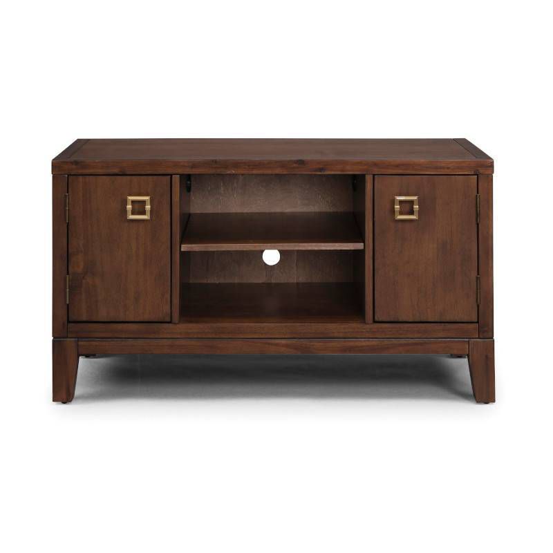 Tapered raised leg frame. 2 doors open to a single adjustable shelf behind each. Unique square door pulls, with brushed bass finish, adding a flare to the design. Open center area features a single adjustable shelf. Wire management access behind each door as well as in lower center open area. Will accommodate most 50" TV's. Arrives to your door by parcel delivery service. Note finish and measurements may vary, assembly required. W-44", D-18", H-24"