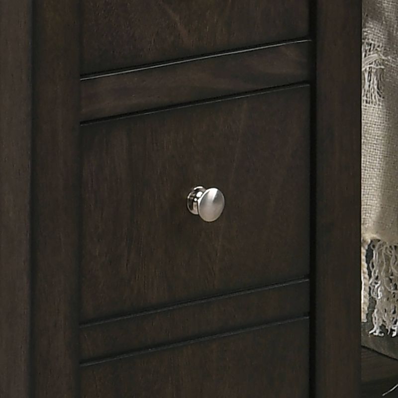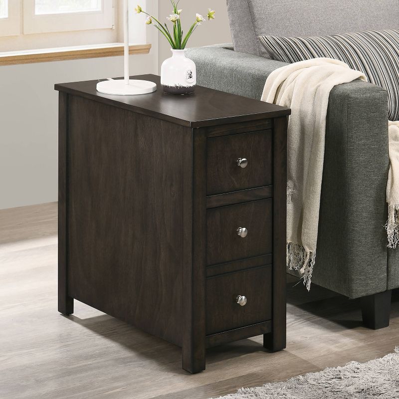 Add functionality and style to a compact sitting area with this charming contemporary end table. It features a tabletop that's long and narrow, perfect beside a sofa or armchair. 3-drawers provide ample space for tucking away essentials and small accessories. The dark gray of its wood base creates a rich, versatile look. Metallic knobs add a shining finishing touch.