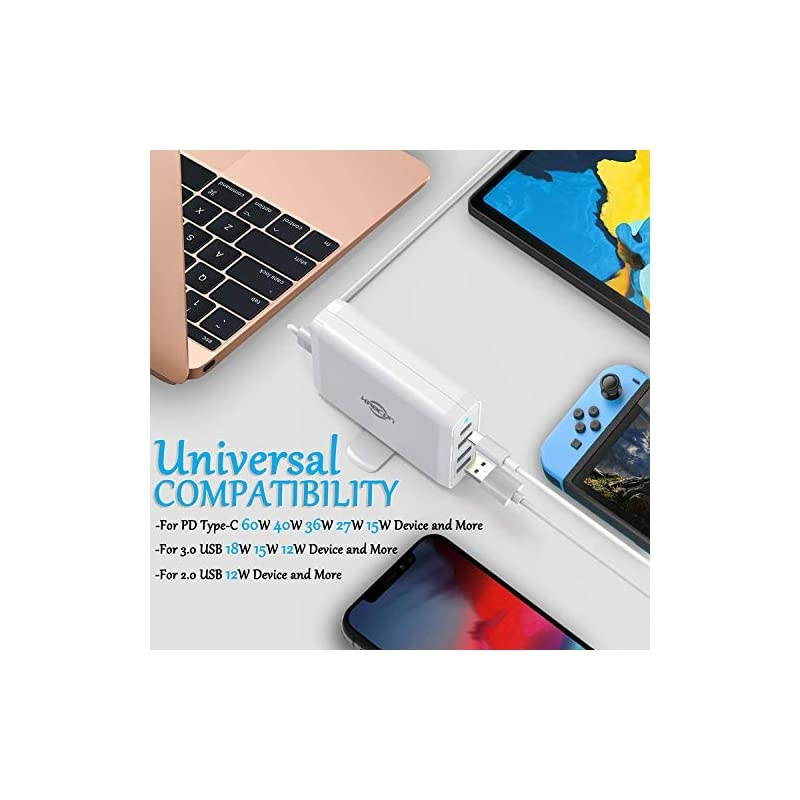 *****PD 60W Type C: Compatible with MacBook Air 2018, MacBook 12 inch 2015/2016/2017, MacBook Pro 15inch&13inch 2016/2017/2018, 2018 iPad Pro, iPhone 11/11 Pro/11 Pro Max, iPhone XS Max/XS/XR, Nintendo Switch, Microsoft Surface Go/Book 2, iPad Air/Mini/Pro, Samsung Galaxy S9 Plus/S9, HP DELL -C Laptops and more. *****A good companion for travel: Support 4 devices to charge at the same time, saving you time, you don't need to bring a lot of chargers when you are on a business trip or a trip. With a 6.2FT AC charging cable, a AC plug and a travel case.