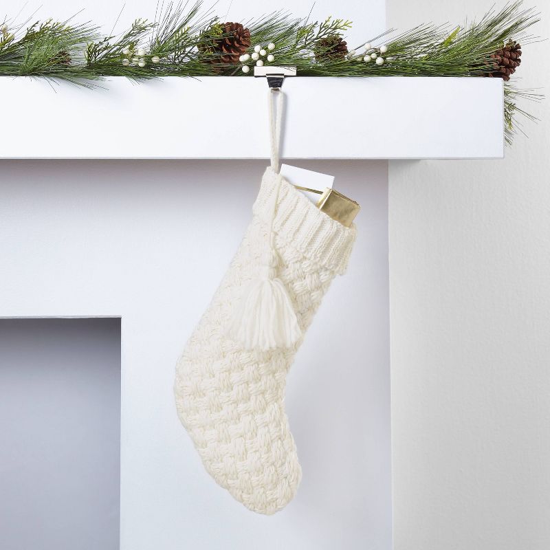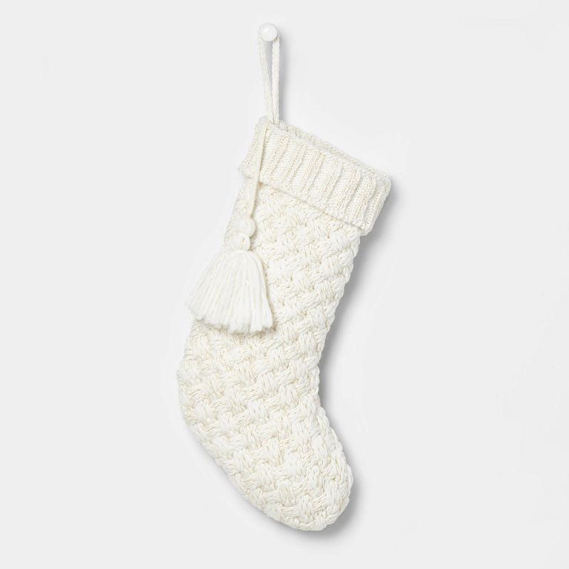 Cozy up your gifting display by hanging up the Cable Knit Christmas Stocking from Wondershop™. This Christmas stocking is made from a cream cable-knit fabric for a classically chic look that'll blend in beautifully with the rest of your seasonal decor. Dangling tassels lend fun flair, while an attached loop makes it a breeze to hang from your mantel, staircase or wall. Whether you fill it with candy, socks, gift cards, lip balm or any other small trinkets, this knit Christmas stocking rounds out your holiday decor in merry style.
